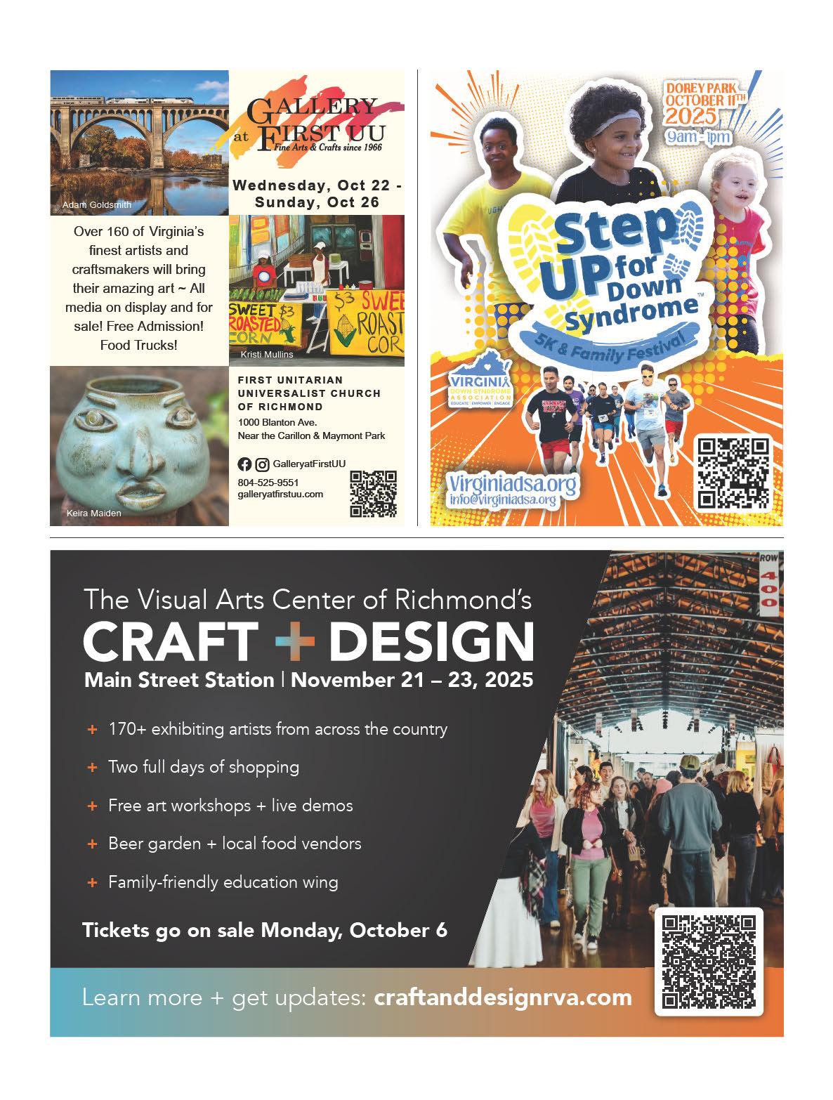 The 43rd Street Festival of the Arts returns to the Forest Hill neighborhood on Sept. 13. In its 34th edition, the juried show will feature work from 75 local and regional artists, including hand-forged jewelry from Richmond-based metalsmith Shawn Noroian and po ery from Richmond’s Lee Hazelgrove, an artist who has been participating in the festival since its debut. Music will be provided by Americana group the Tin Can Fish Band, The Grateful Dads (who perform an array of jam band covers) and indie folk duo Haze & Dacey. Shop unique creations, dance to the live tunes and stop by the food trucks to fuel up. The festival runs 10 a.m. to 4 p.m. Admission is free, and a portion of sales benefit CARITAS, a nonprofit that provides services for people experiencing homelessness or addiction. facebook.com/43rdstfestival Ma hew Sporn
