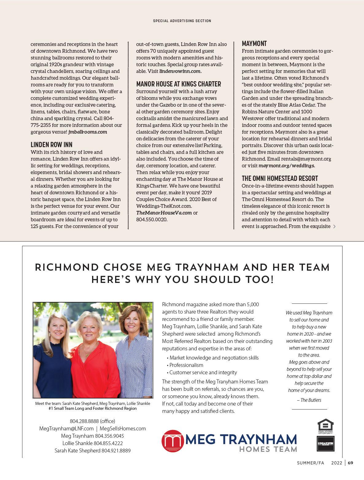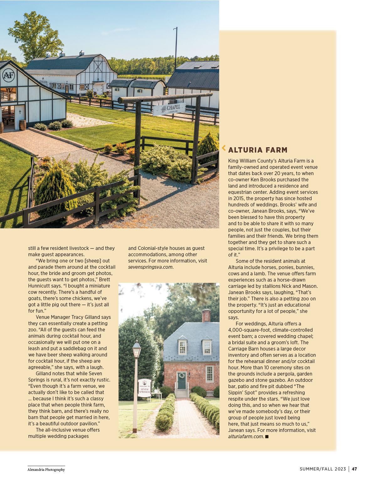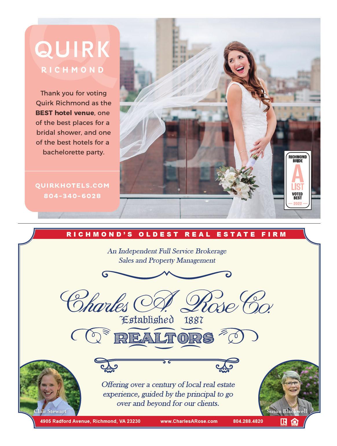 Blanton suffered a stroke in 2019 on the Friday morning of a twowedding week end. He was rushed to JohnstonWillis Hospital, where he spent the next 40 days. “I can only imagine what the couples were thinking,” Debbie says. “If I were a bride, I would be freaking out that the owner has had a stroke.” The Gordons credit their staff and family members with ensuring the weekend events continued as planned. They note that Colon, their soninlaw Brett and their son, Brice, stepped up while Blanton was in the hospital.