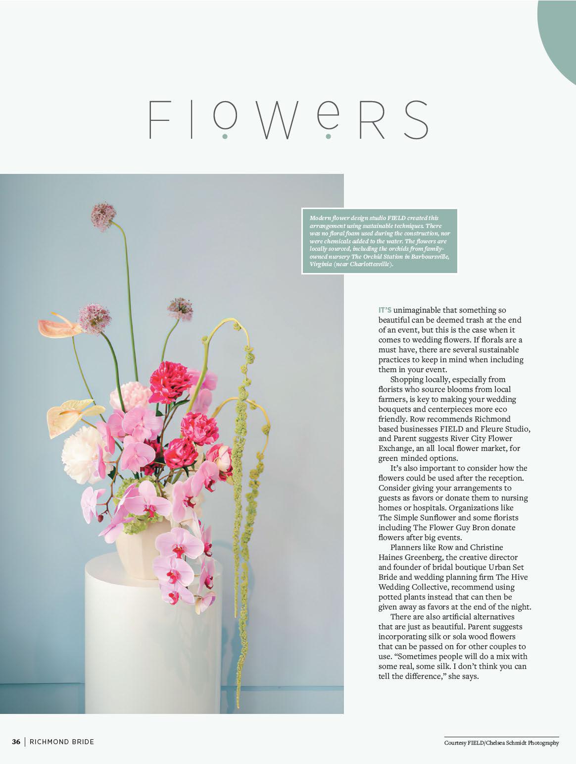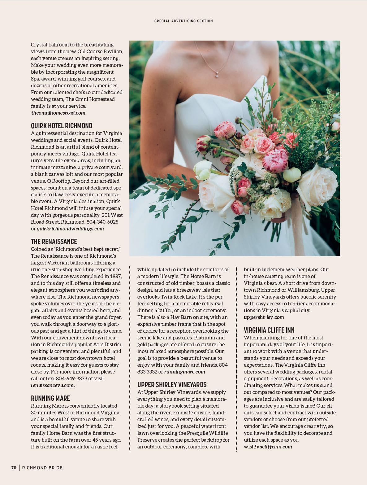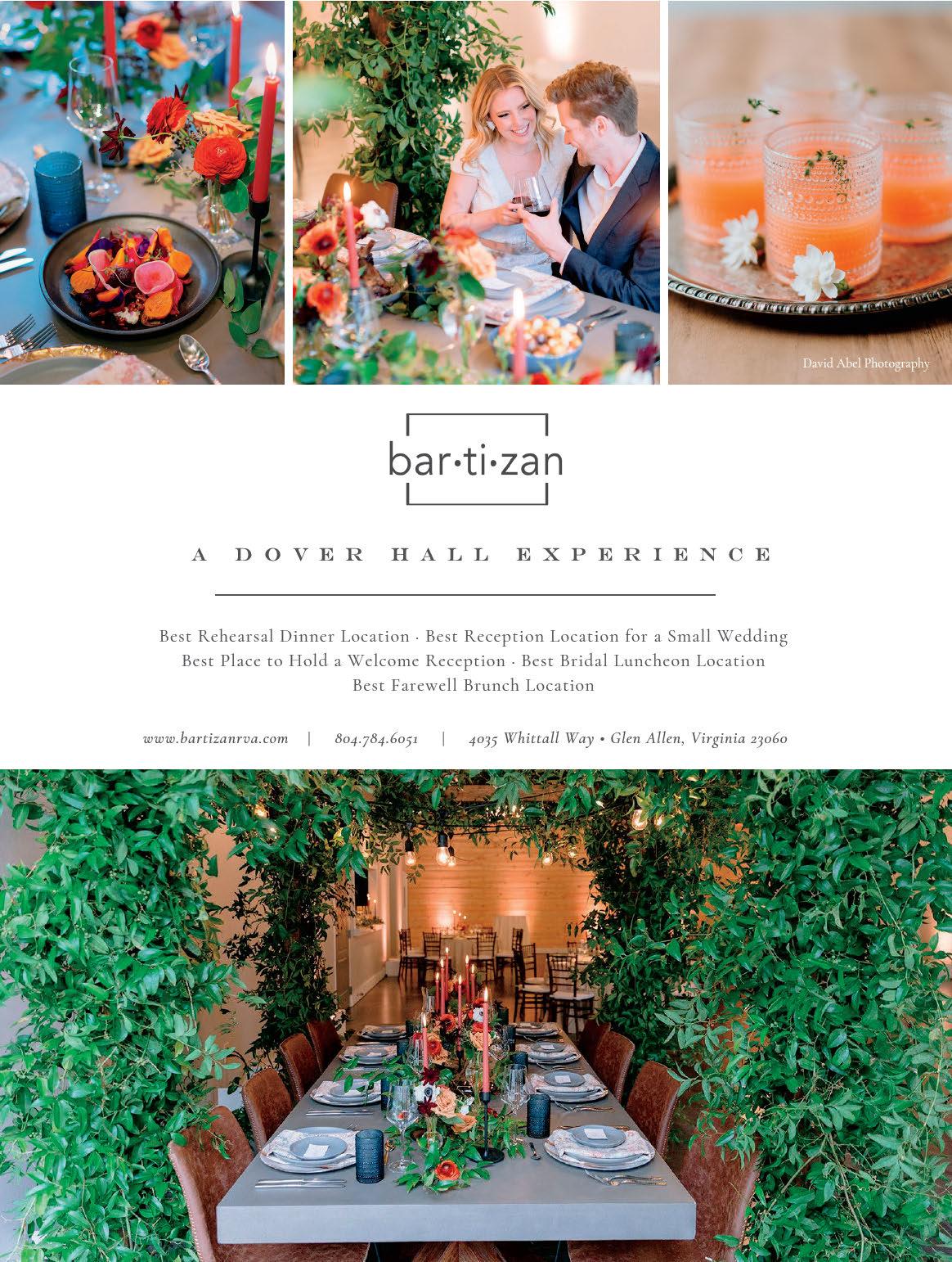 Vogue Flowers is a local, family-owned florist that has been supplying RVA with beautiful blooms, professional design, and excellent customer service since 1985! With an eye for luxury, trending styles and the promise of unbeatable prices, any bride is sure to have her expectations exceeded. Offering everything from bouquets to boutonnieres, from tablescapes to on-site installations, Vogue does it all! Vogue even offers a DIY workshop, wholesale pricing, and precise, temperature-controlled refrigeration for our Do-It-Yourself brides. Book a complimentary consultation and share your vision with Vogue so they can take your unique style to the next level. Call 804-353-9600 or email us at weddings@ vogueflowers.com to book your appointment. vogueflowers.com.