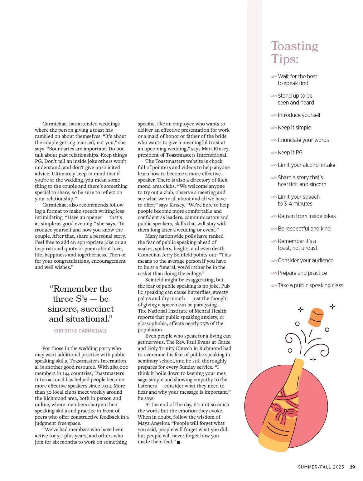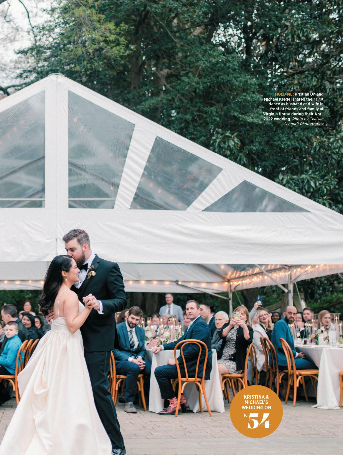 The groom’s Richmondbased band, Mashup & Cozy Condition, performed at the celebration (read more about it on Page 80). One of the couple’s favorite moments was when the bride’s 13yearold daughter got onstage with the band and performed “Ice Ice Baby” by Vanilla Ice. “She had memorized all the words and did the whole song perfectly,” Laura says. “I’ll never forget it it was hilarious.”