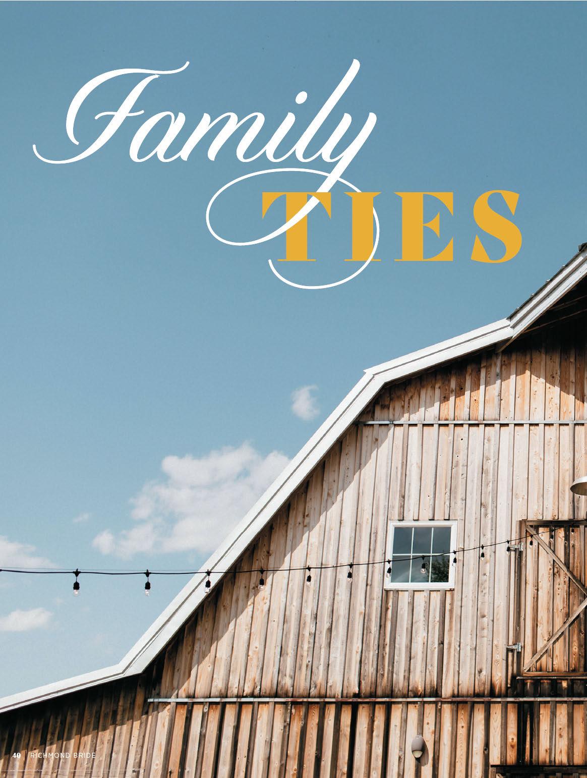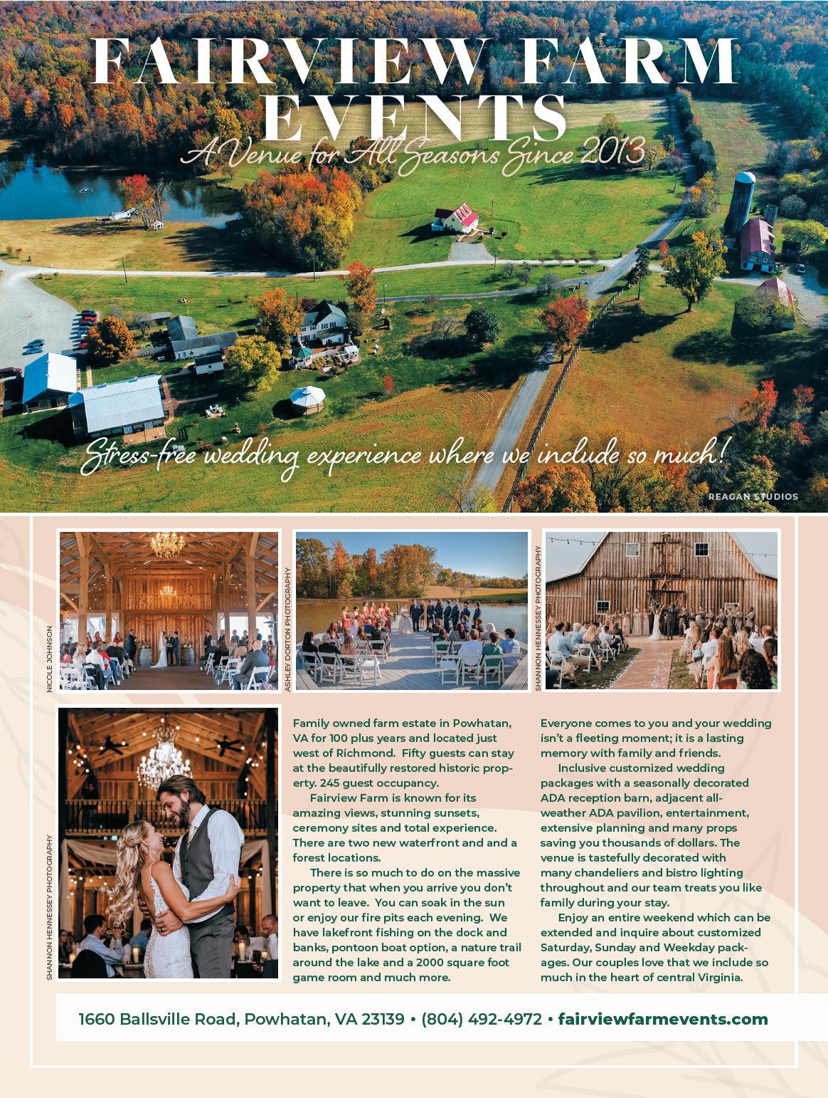 Fairview Farm continues to be a family af fair. The Gordons’ oldest daughter, Mallory, lives behind the venue, and a cousin runs a farming operation on the edge of the land. Blanton enjoys welcoming couples who come on tours by sharing the farm’s family history. “I was so involved with it for so long as my home and a farm when my grandfa ther did it,” Blanton says. “I’m just telling people what it was and how it was, and a lot of people have appreciated that fact. They like the fact that it’s not just a venue.”