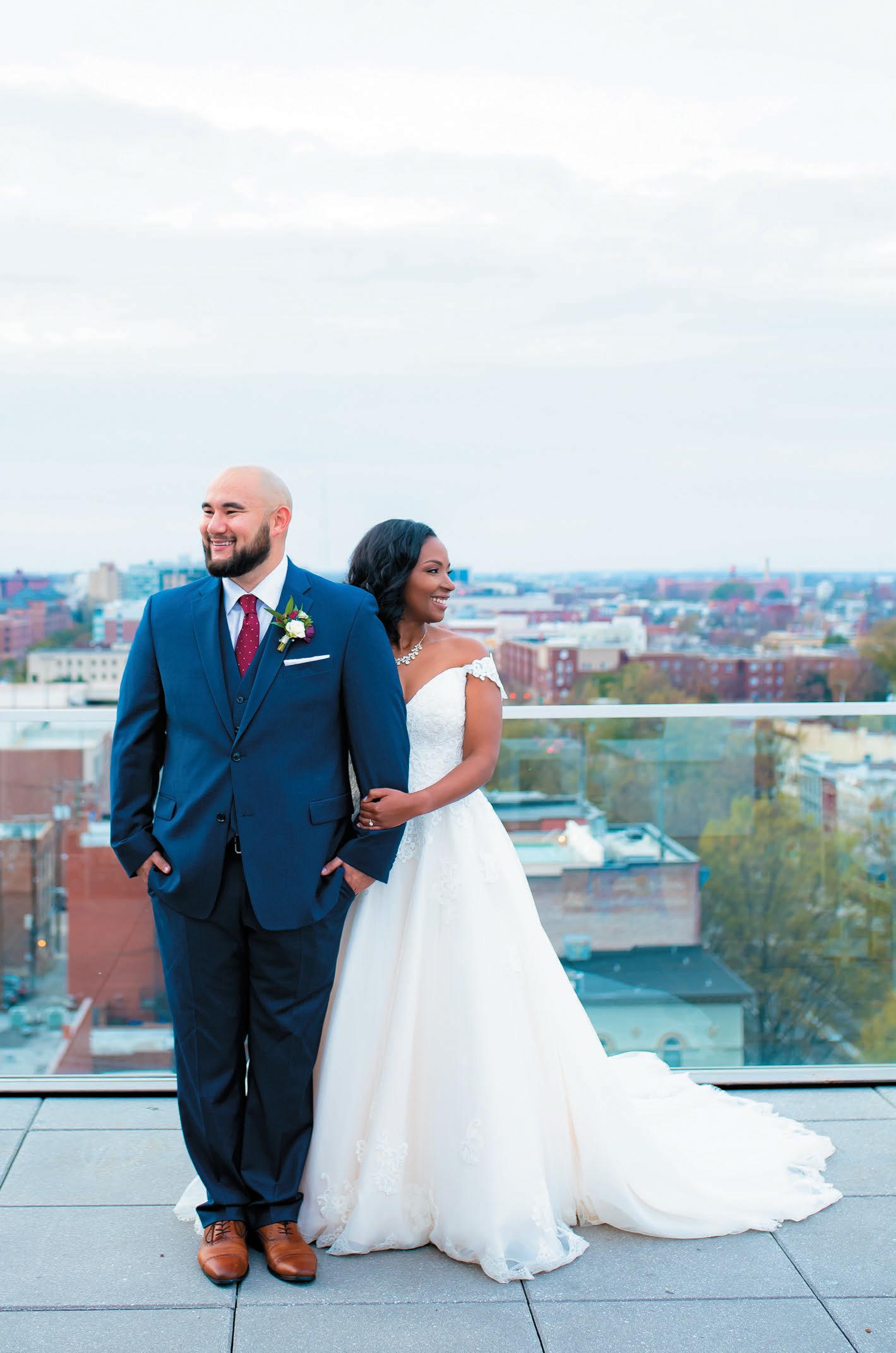 AT FIRST TOUCH: Josie and Lee didn’t want a first look, but instead opted for a first touch on Quirk Hotel’s rooftop prior to the ceremony. Josie was able to see Lee, but photographer Jessica Capozzola had to get creative with her shots to keep the groom from seeing the bride prior to her march down the aisle. Josie’s ivory and soft blush Stella York gown is from The Bridal Boutique in Columbia, Maryland.