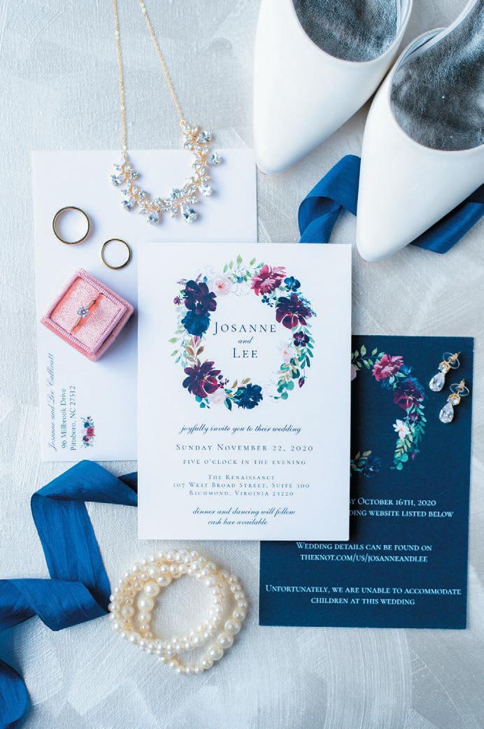 HE’S GOT THIS: Using an online template, the couple created their invitation suite incorporating their wedding colors of navy, burgundy, dark violet and soft pink. “Lee really enjoys designing things, so he pretty much took the reins on it,” Josie says. “He pretty much did it by himself.”