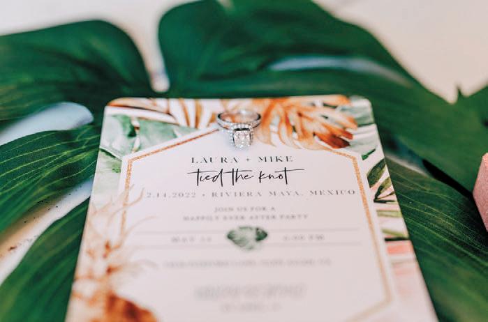 Laura and Mike decided to tie the knot during a private ceremony in Riviera Maya, Mexico, on Feb. 14, 2022. Exactly three months later, they celebrated their nuptials with a grand Mexicanthemed fiesta, hosted at the home of a friend who lives in the couple’s neighborhood, Glen Allen’s Moun tain Run at The Federal Club. About 120 family members and friends attended the tented backyard soiree, which was envisioned and planned by the bride. “I absolutely love plan ning parties,” she says. “I’ve done birthday parties for my children for years. It was a lot of fun to put it all together.”