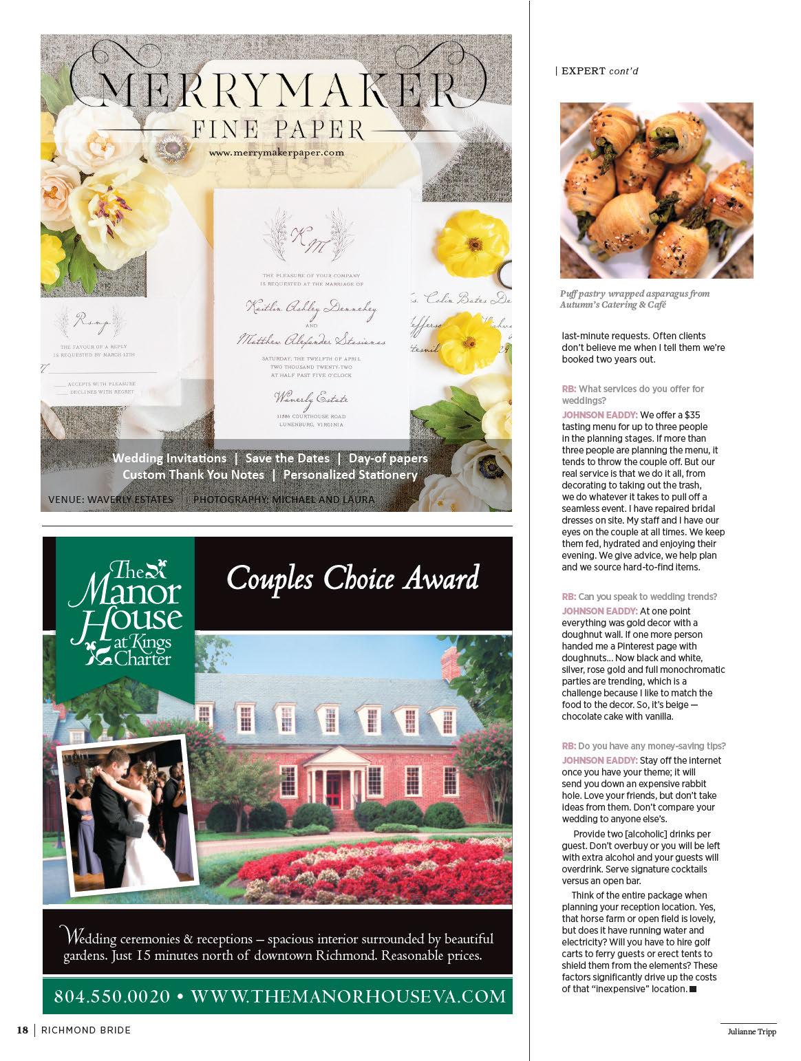 Johnson Eaddy moved to Rich mond in 2001 and opened Autumn’s in Lakeside in 2003. Last March, she moved operations to Paragon Place in the West End. She conducts her catering business from a cafe that’s open MondayThursday. In addi tion to celebrating her 20th year in business, she made The Knot's “Best of Weddings” list and was a winner of Wedding Wire’s Couples’ Choice Awards for the second time.