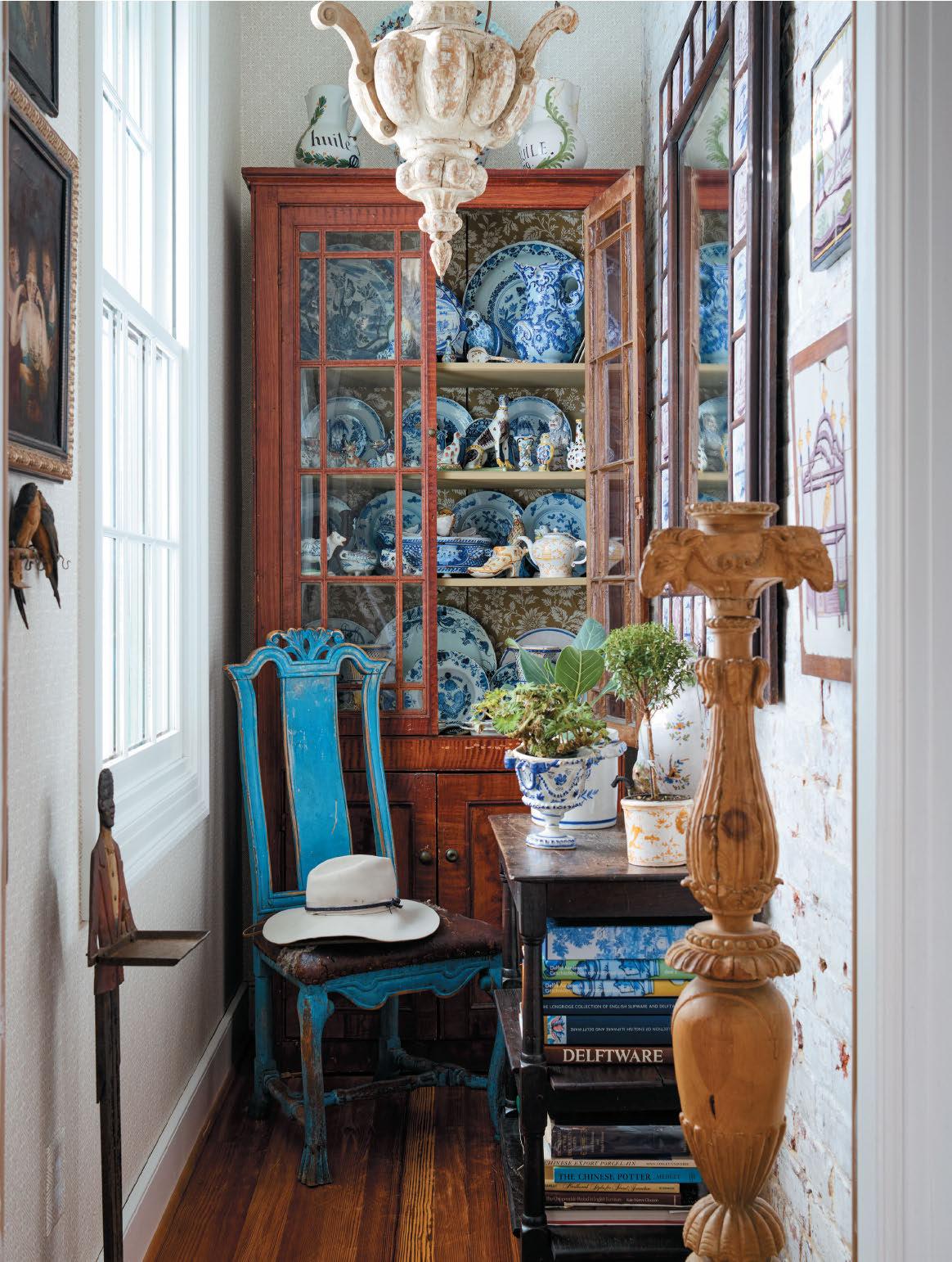 Every room features tiles –Dutch Delft and French faience in particular – found in her travels. “I’ve sold and collected tiles for years … picked up a box of tiles here and a box of tiles there. … I’m crazy about pottery, and I’ve always loved blue