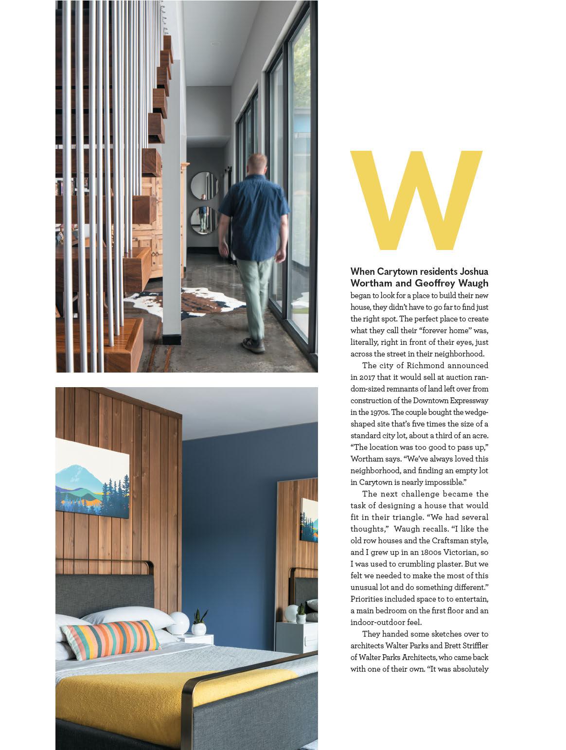 Although Geoffrey Waugh and Josh Wortham spent their formative years in Chester and Kentucky respectively, today they wouldn’t live anywhere but Carytown. Their dream house became a reality when they purchased one of the last remaining plots of un developed land in the neighborhood and brought in Walter Parks Architects to design a home to fit the wedge-shaped lot. Elizabeth Cogar takes us on a tour of their striking modern home on Page 48.