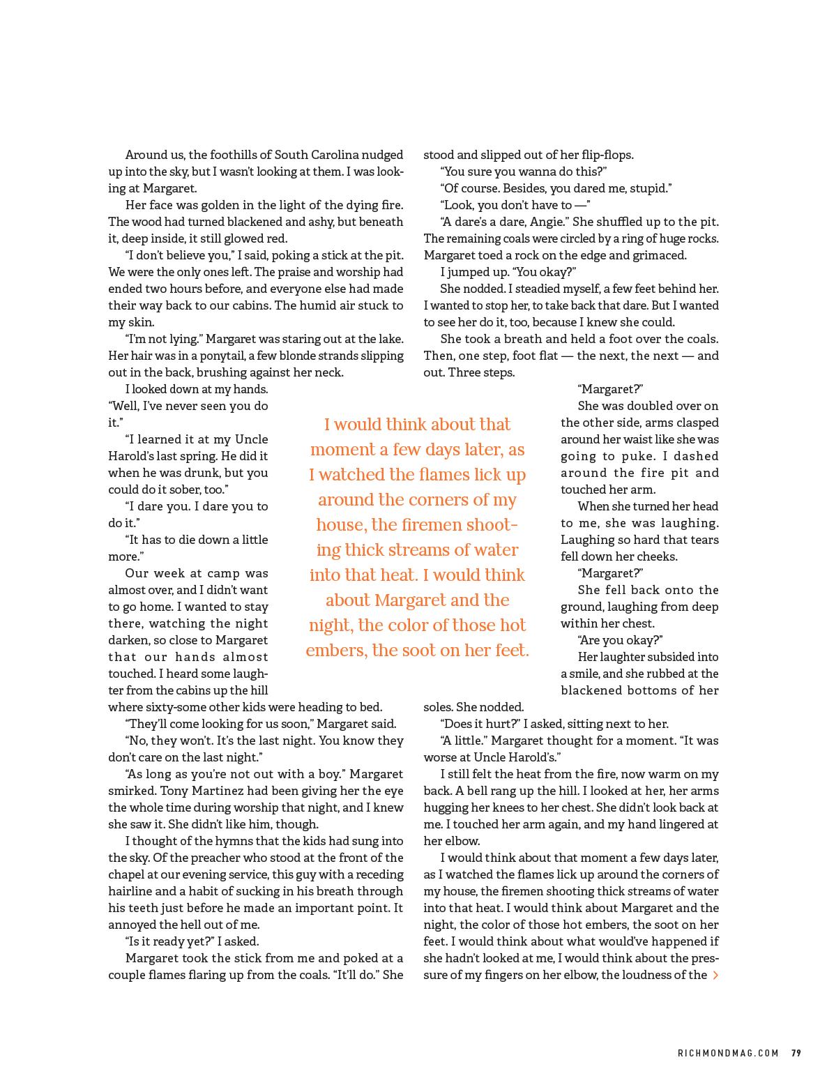 If it hadn’t been so dark, if I hadn’t had this feeling that things were going to change, if I hadn’t seen the way Tony had been looking at her, if I hadn’t thought about starting high school in just a few weeks, if I hadn’t felt my heart beating against my ribcage when I thought she was hurt by the fire, maybe things would’ve been different. Maybe I wouldn’t have been able to say what I’d said. It was stupid, I know, and I know be er now, but I was fourteen. And there we were, faces barely captured by the glow of dying coals, the lake still and beckoning, our voices masked by the chirping chorus of night noises, cocooned by the water’s edge.