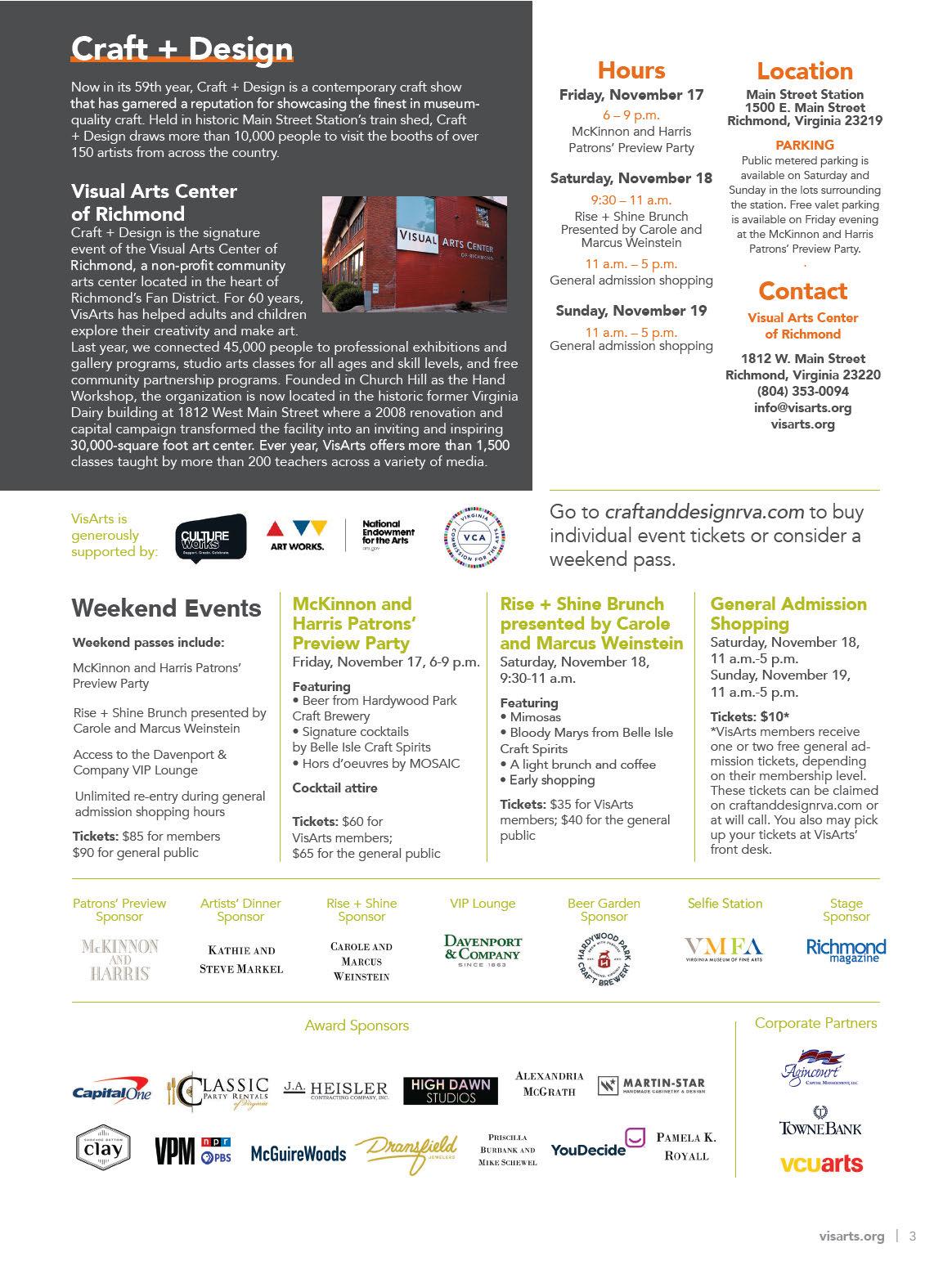 More than 200 teaching artists call the Visual Arts Center of Richmond home. They are sculptors and printmakers, weavers and metalsmiths, photographers and ceramicists, and together they make it possible for VisArts to offer more than 1,500 community art classes a year. The following VisArts teachers earned spots at Craft + Design through a special selection process: