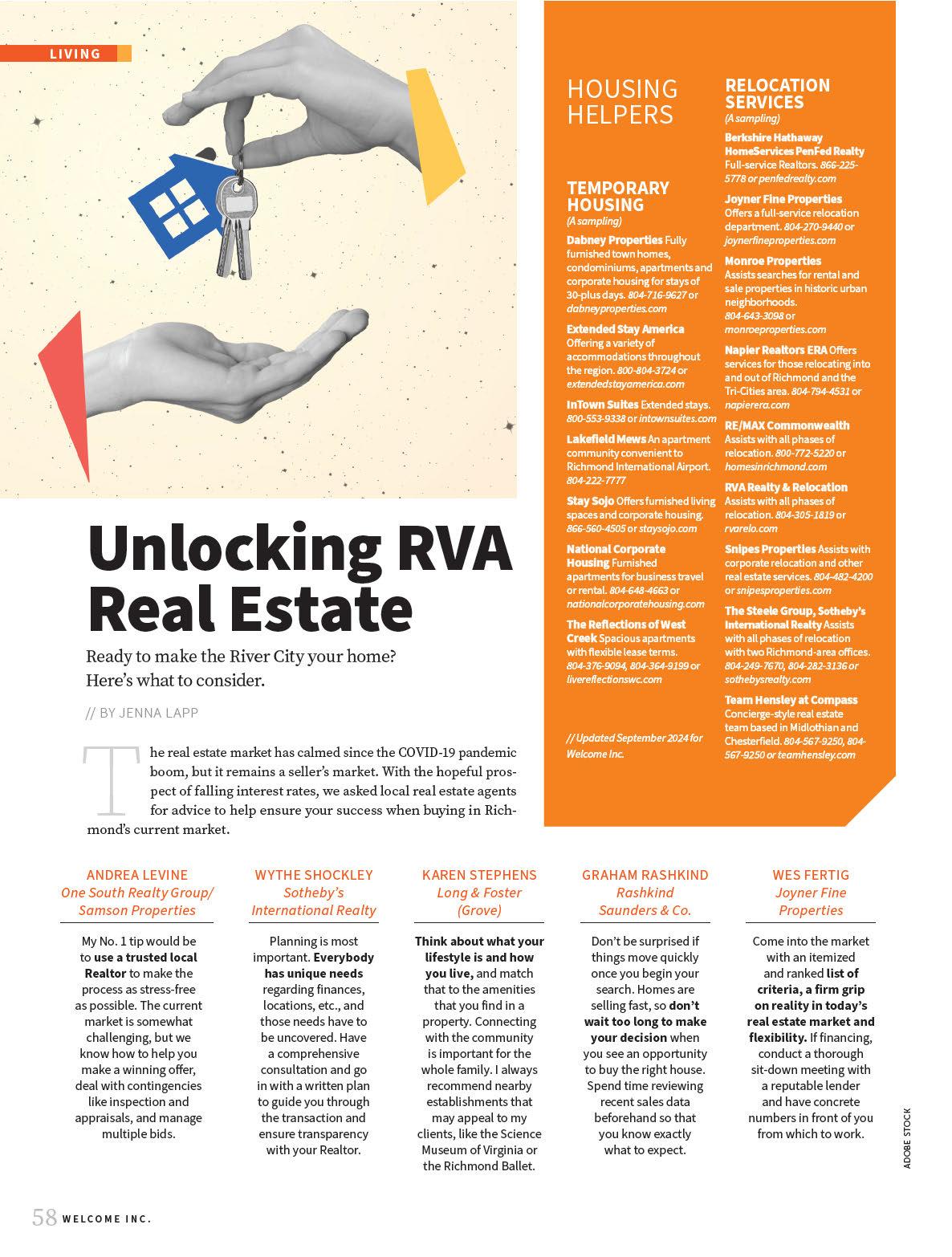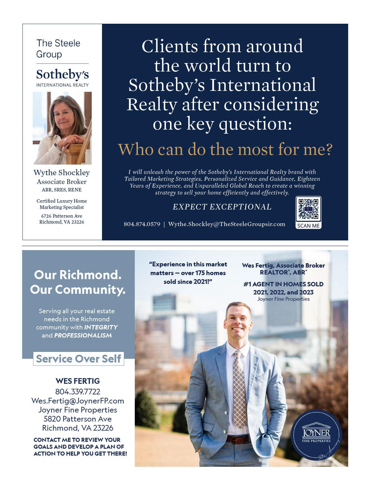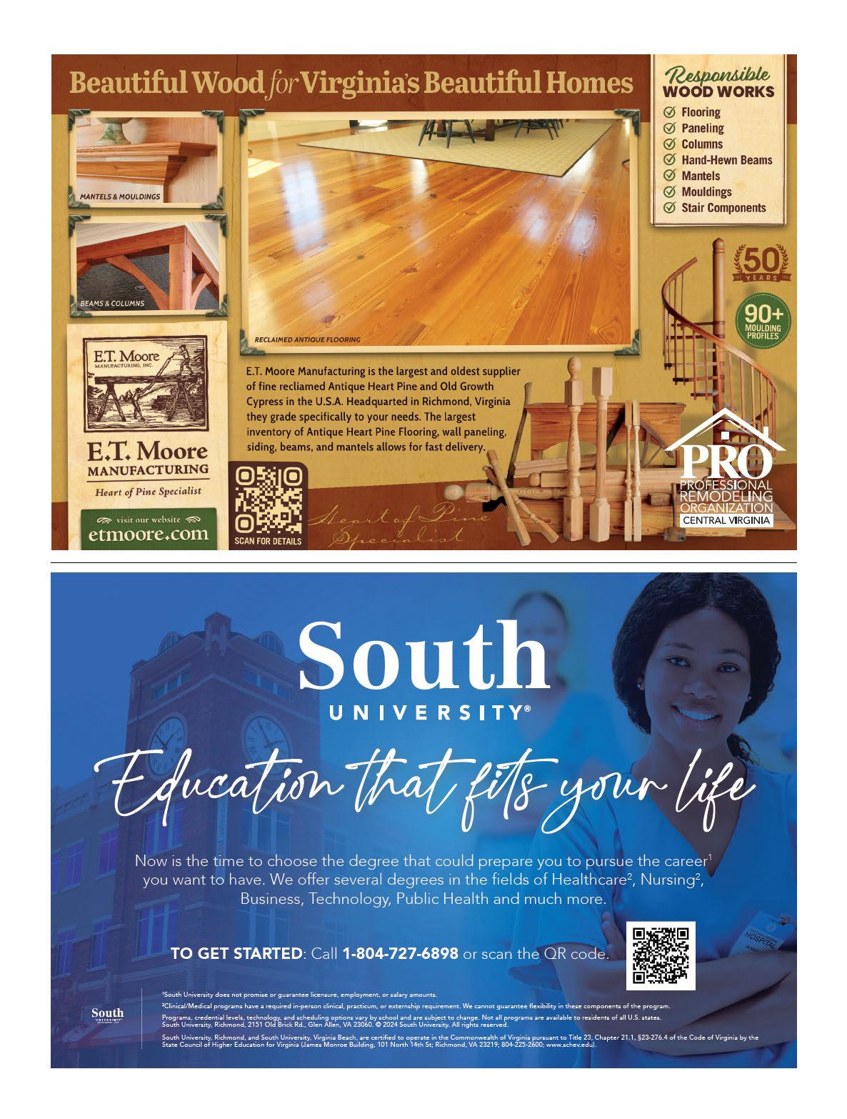 The city’s neighborhoods are walkable and bikeable, brimming with shops, restaurants and entertainment venues. You’ll find turnof-the-20th-century rowhouses in the Fan, Jackson Ward and the Museum District, a youthful industrial vibe in Scott’s Addition, art galleries and hip living spaces in the Downtown Arts District, pre-Civil War homes in Church Hill, lo s in converted warehouses in Shockoe Bottom and stunning James River views in Union Hill.