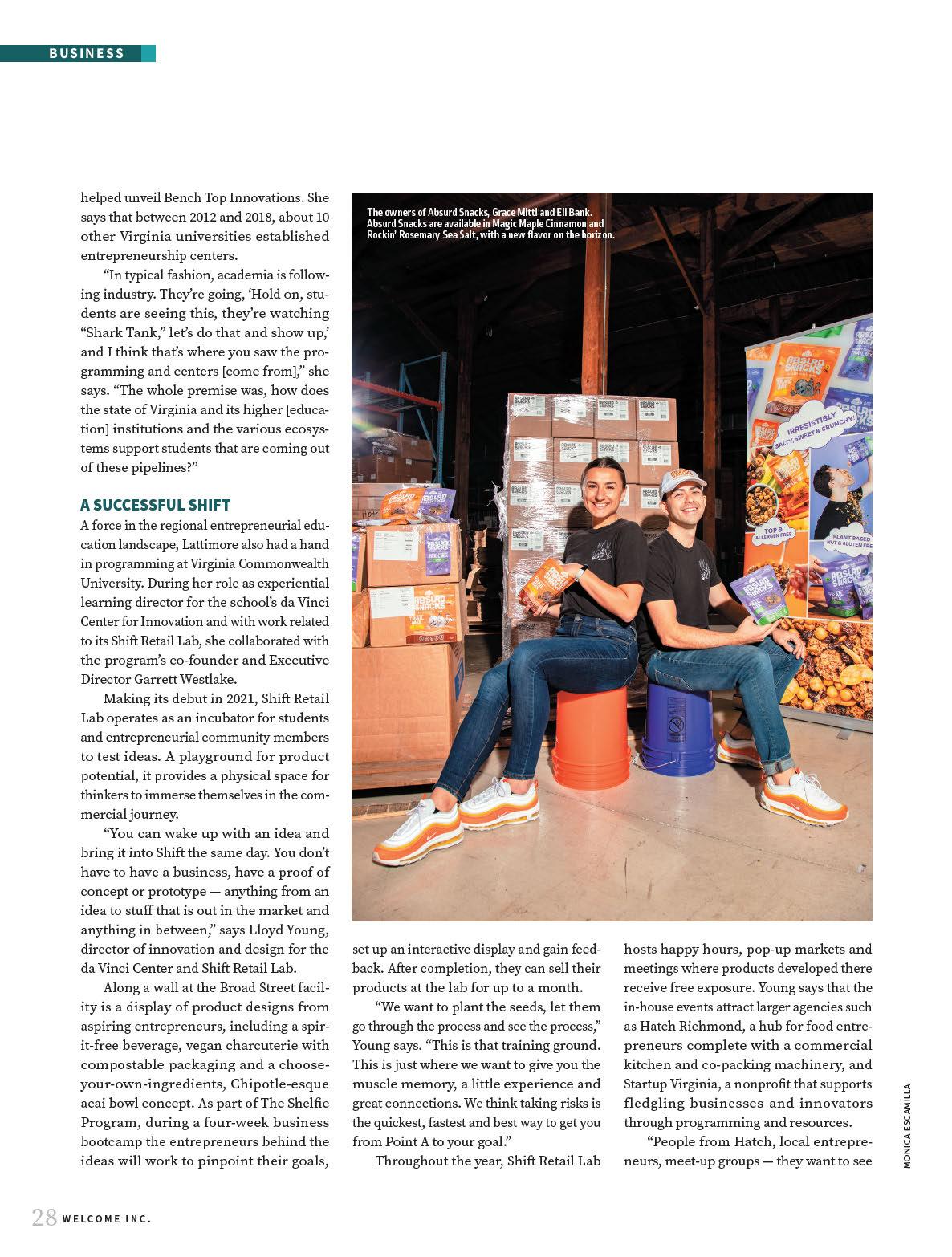 Although Shift Retail Lab wasn’t founded strictly for food and beverage businesses, Young says there is no denying the appeal of that category. “Food has been something we weren’t really looking for when we opened it, but it has been a big theme,” she says, noting one of their most successful Shel e participants was a vegan jerky product, Jacked! Jackfruit Jerky. “It’s become so popular that my next project is expanding the Shi brand.”