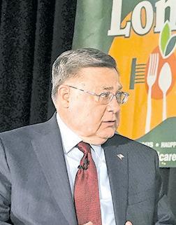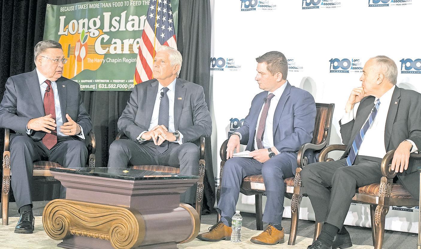 S.C. Exec. Ed Romaine, left, speaks at the Long Island Association Breakfast Jan. 9 where he pointed to the possibility of putting solar panels in industrial areas throughout the county. With him are, left to right, N.C. Exec. Bruce Blakeman, LIA President Matt Cohen and NYS Comptroller Tom DiNapoli.
