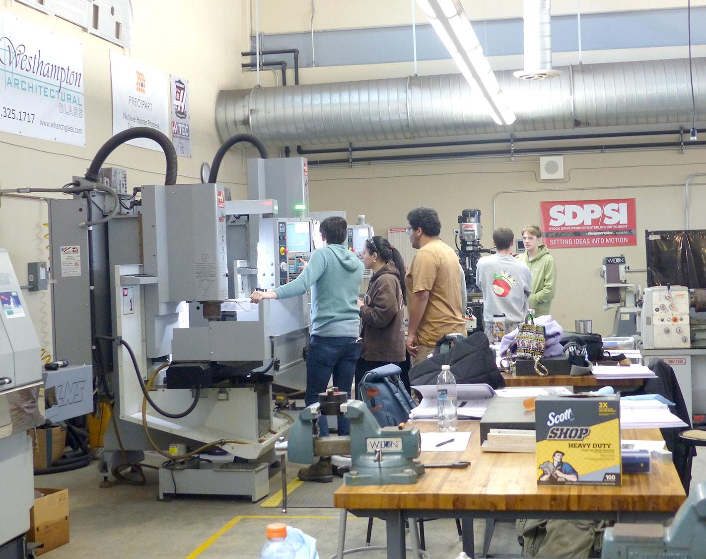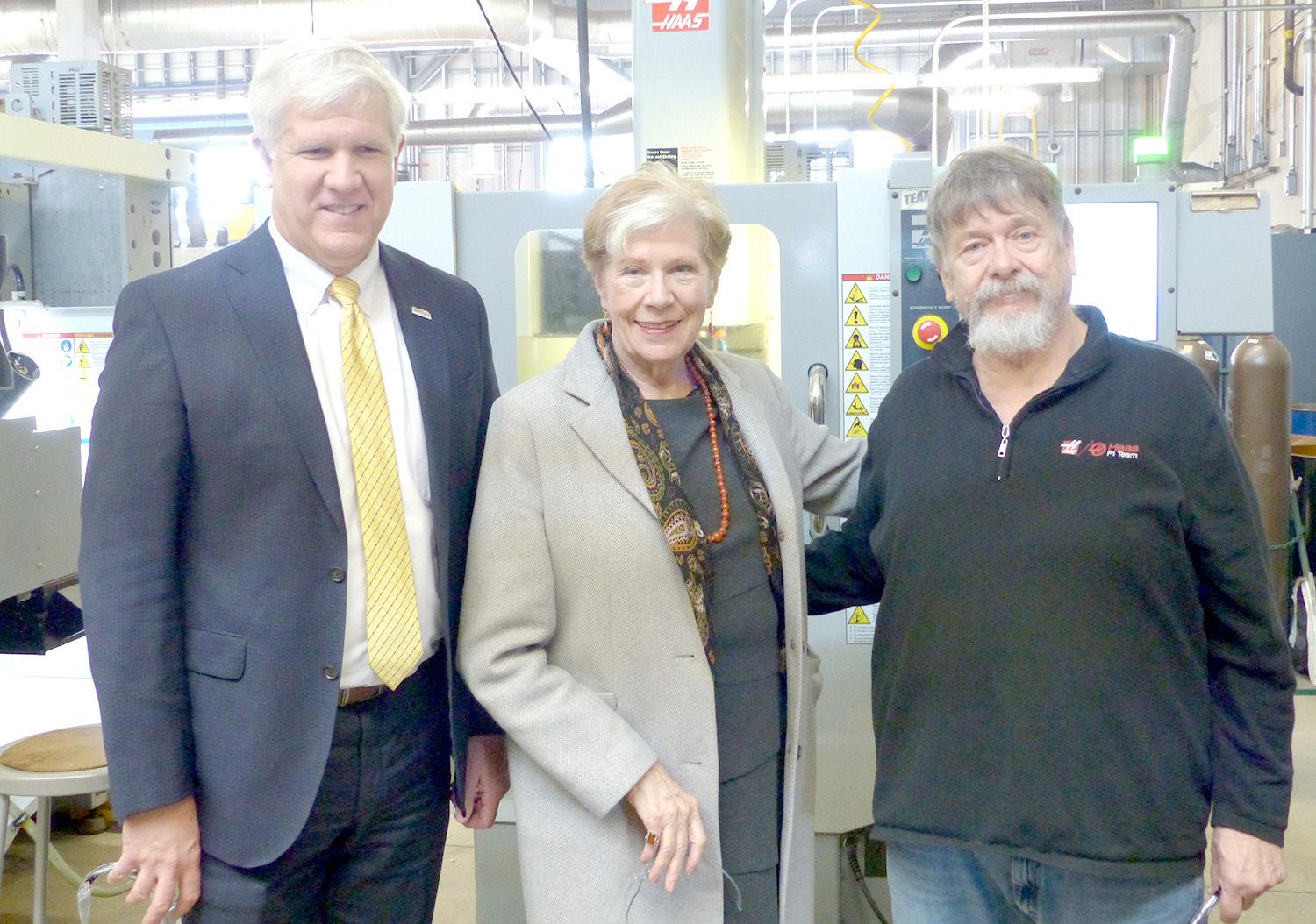 Carolyn James/Herald Photos Edward T. Bonahue, President, Suffolk County Community College, Labor Commissionre Roberta Reardon and Mike Fabrizio, director of SCC College’s CNC program.