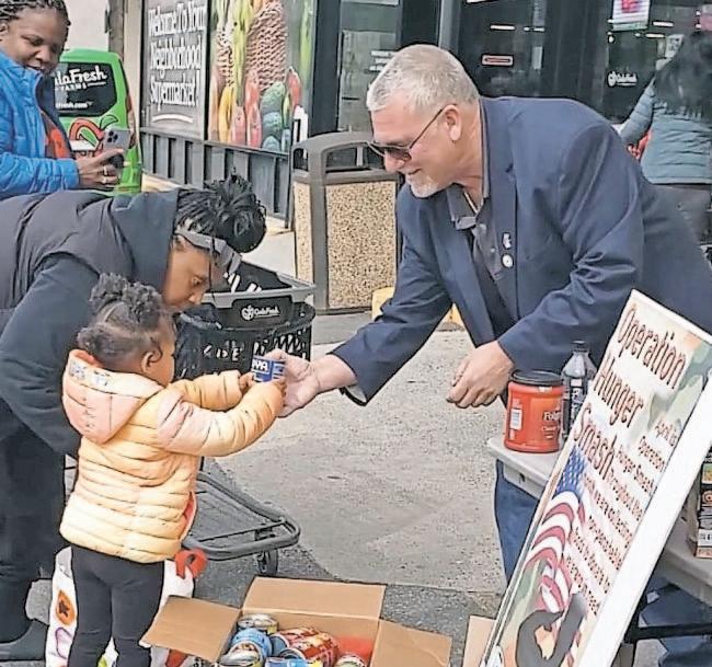 Bottom Photo: A young girl, Jasmine, hands Ben Jackson canned goods as part of ‘Operation Hunger Smash,’ a food drive directly helping area veterans.