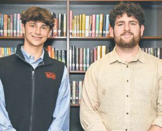 Salutatorian Jayden Simon, left, and valedictorian Mark Prainito don sashes, demonstrating their high academic standing.