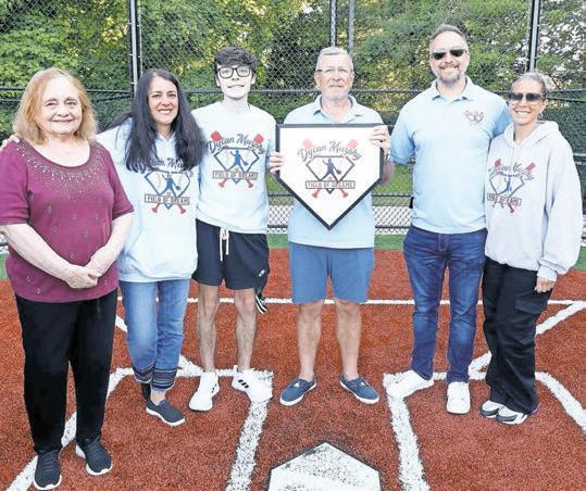 Courtesy John Murphy John Murphy holds a designer home plate for the new baseball field at Saw Mill Elementary School and credits wife Donna, second from left, for coordinating the fundraising that helped build it in honor of their late son Dylan. Fundraising will continue for a scoreboard and pavers.