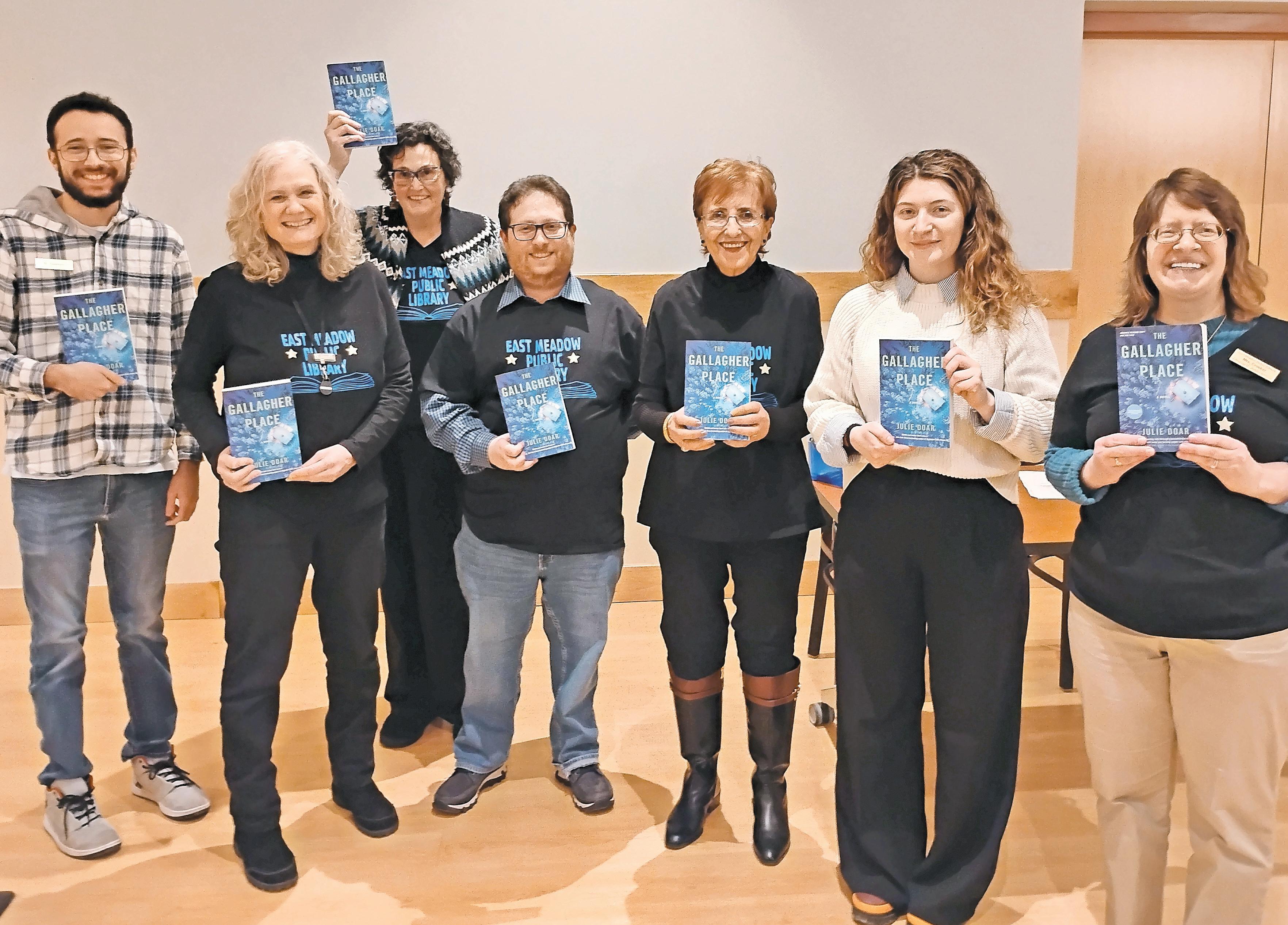 Members of the East Meadow Public Library’s Mysteries and Thrillers Book Club received signed copies of “The Gallagher Place,” written by Julie Doar, second from right, last month.