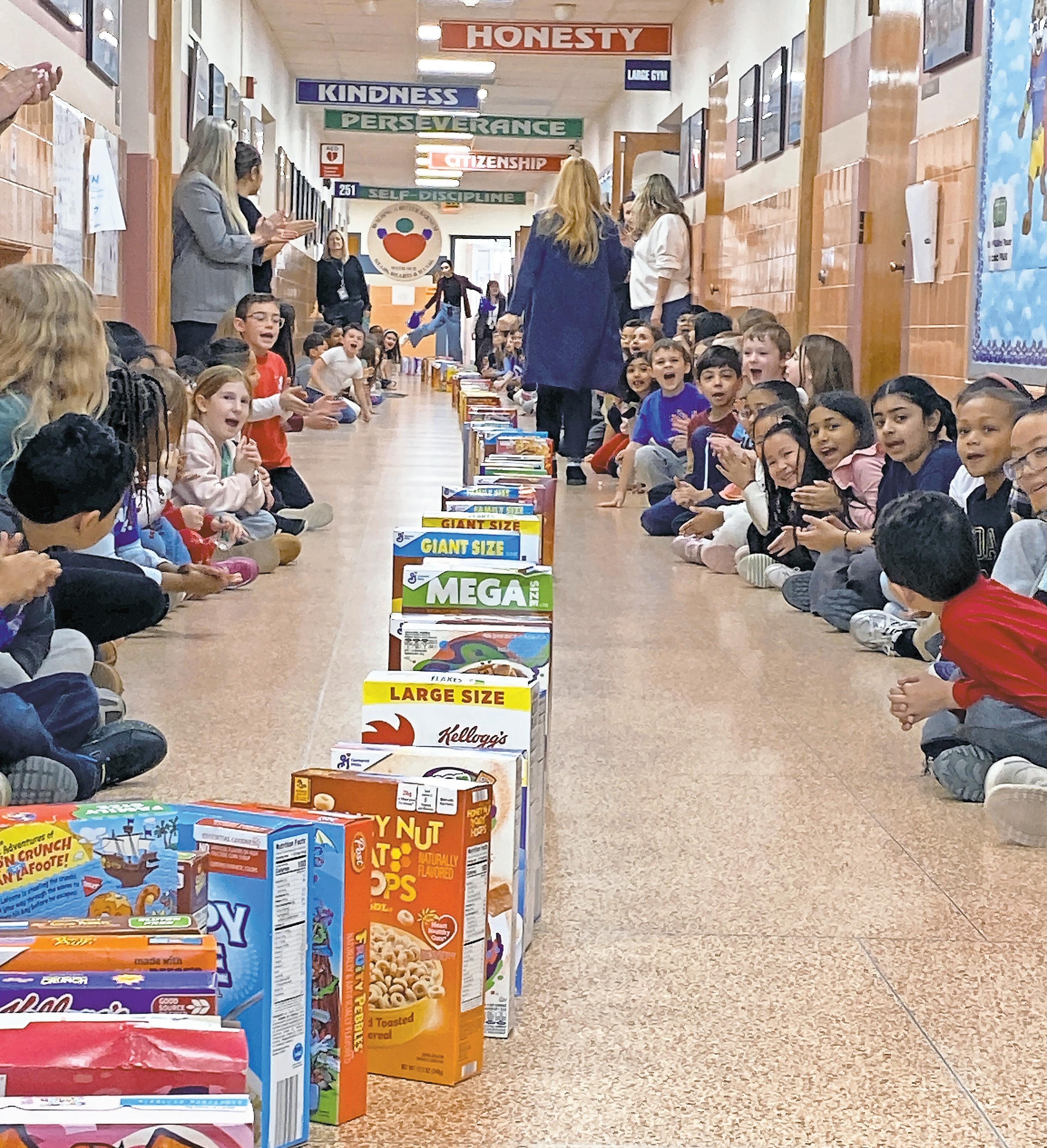 elementary School took a break from class to set up hundreds of cereal boxes in a domino display to celebrate the completion of the food drive.