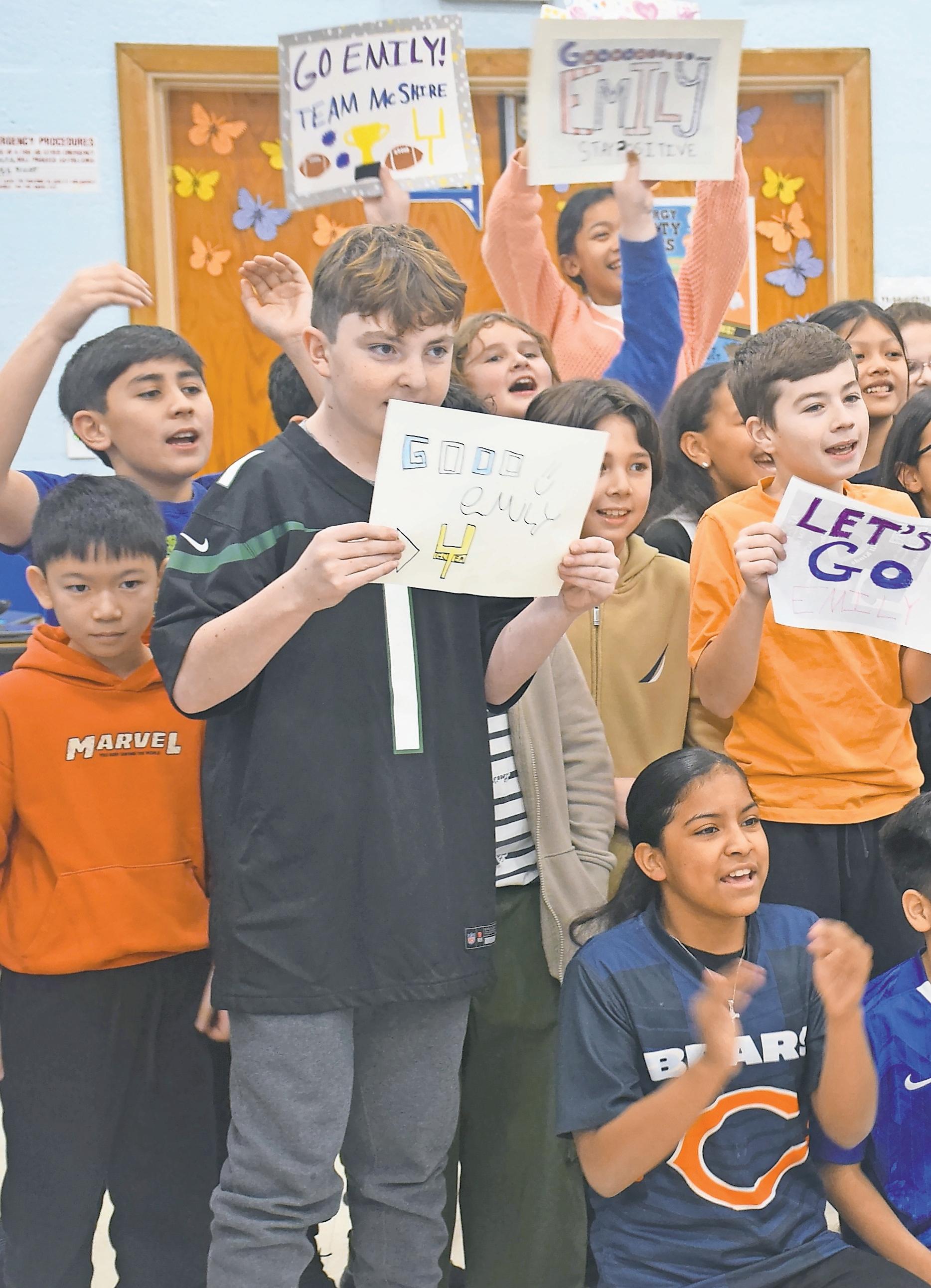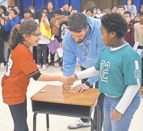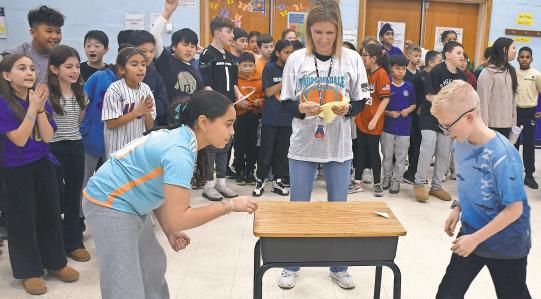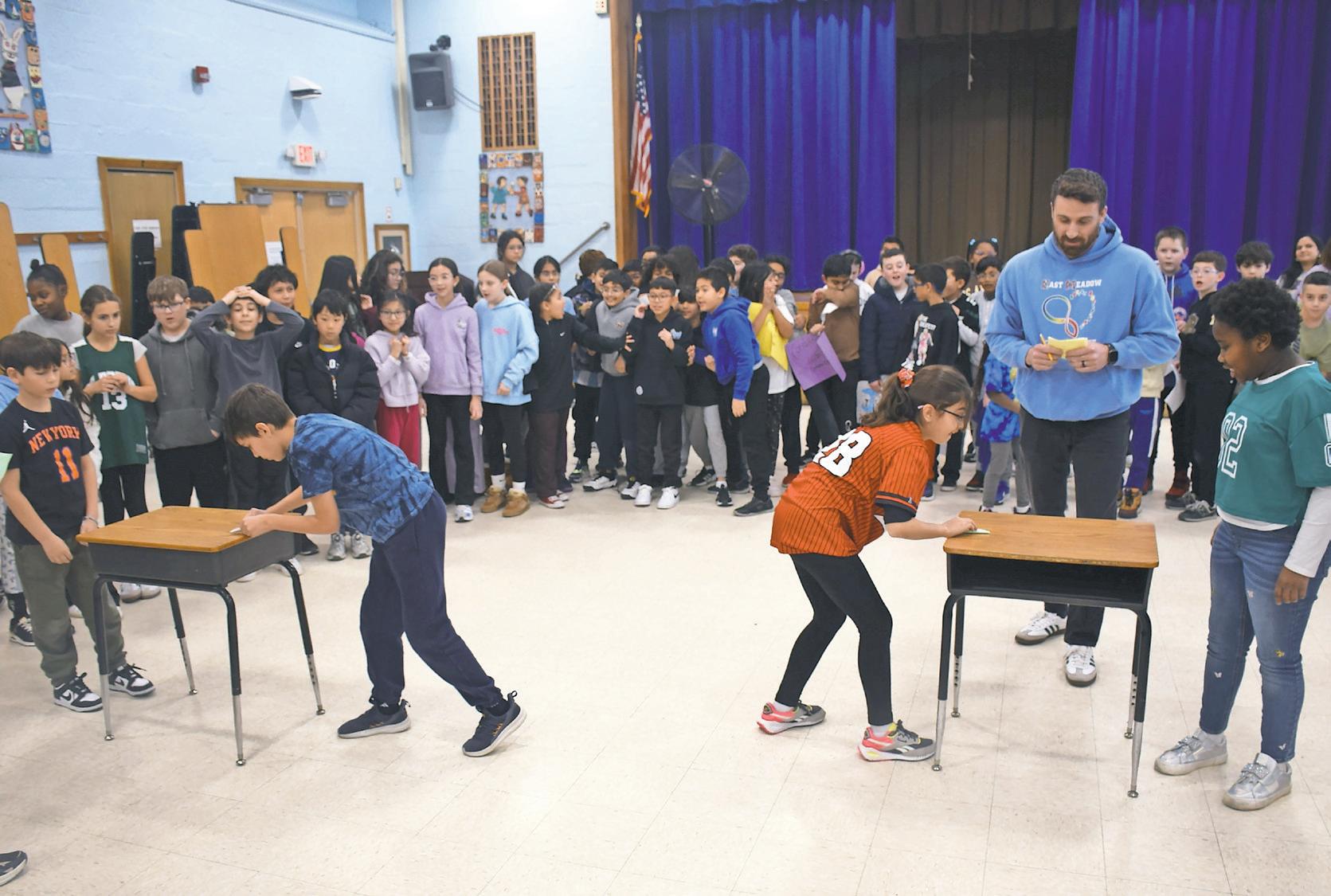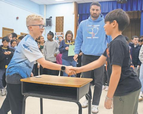 The 2025-26 NFL season may be over, but that didn’t mean that fifth-graders at Bowling Green Elementary School in East Meadow couldn’t engage in some friendly competition. Students and teachers dressed in their favorite sports jerseys cheered on their classmates during a spirited paper football challenge. The objective of the challenges was to push a paper football across the desk without it falling, symbolizing a touchdown. Above, students engaged in the competition while sporting their favorite teams’ jerseys. Right, non-competitors cheered on their peers. Story, more photos, Page 10.