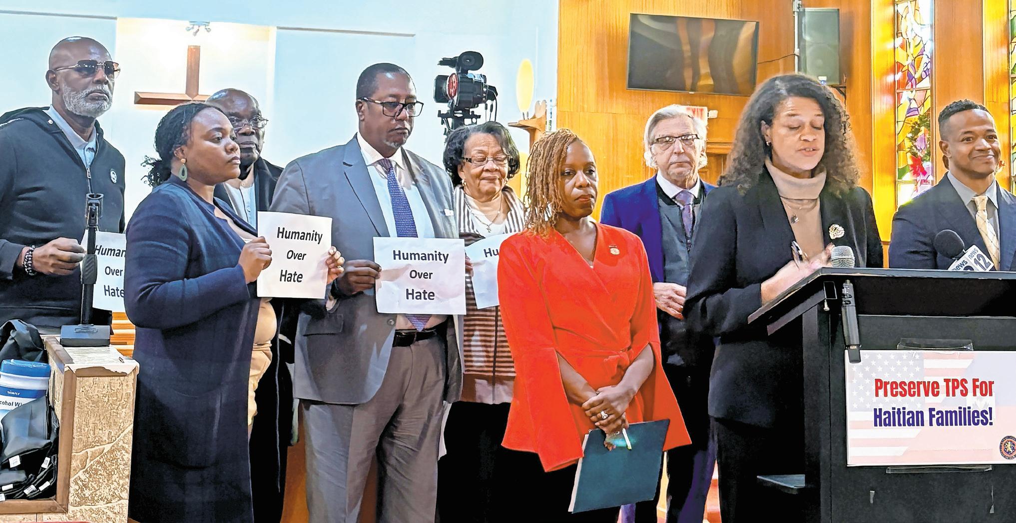 including County Legislators Vivianna Russell and Cynthia Nunez at Bethany French Baptist Church, in Elmont. Russell cited estimates that mass deportation of Haitians if their TPS were revoked could cost taxpayers $88 billion. She said those funds could instead be invested in education, housing