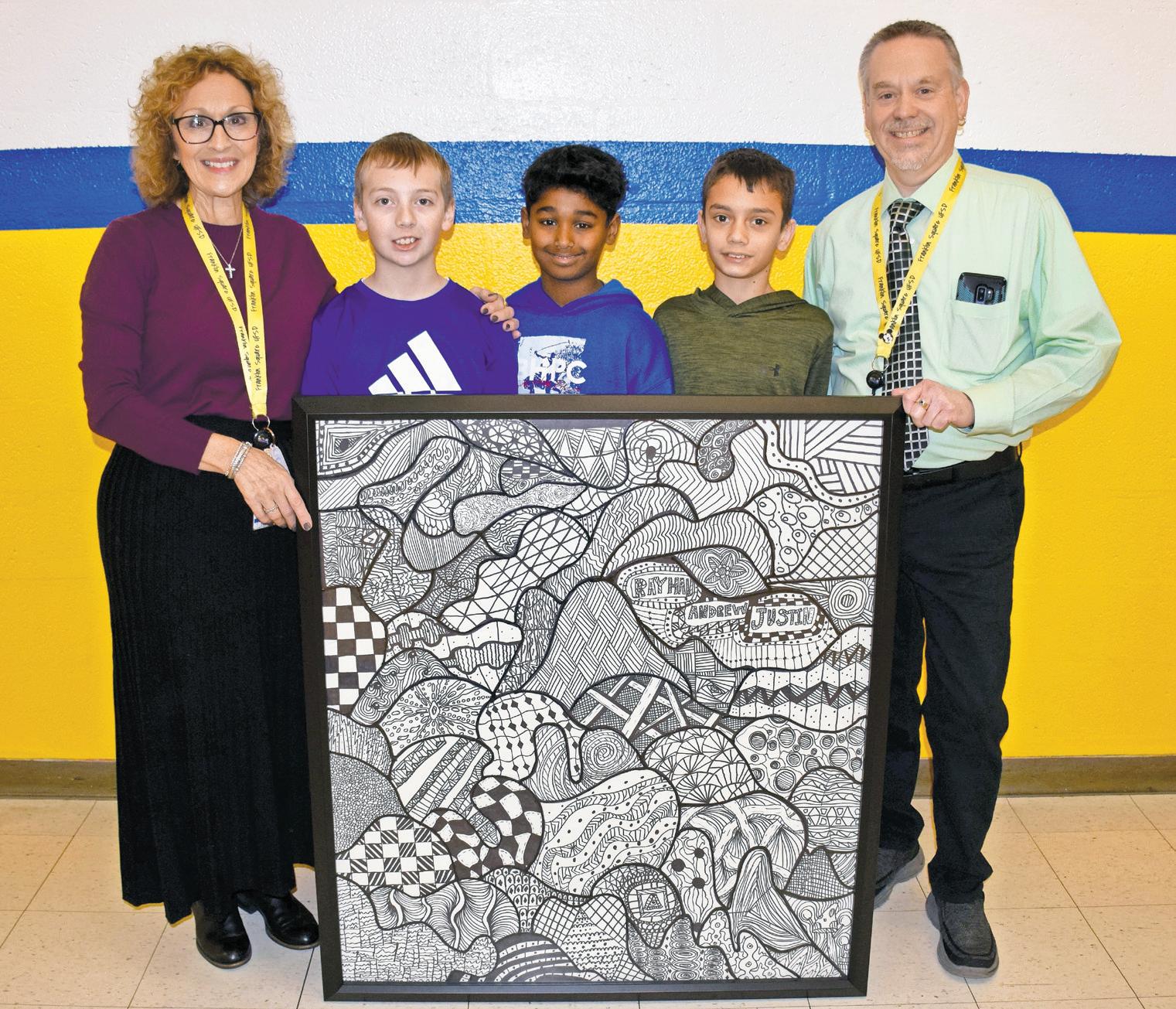 Sixth graders Rayhan Poyyathuruthy, Justin Sabesan and Andrew Spinelli at John Street School recently unveiled a large-scale Zentangle artwork now displayed in the school’s first-level hallway.