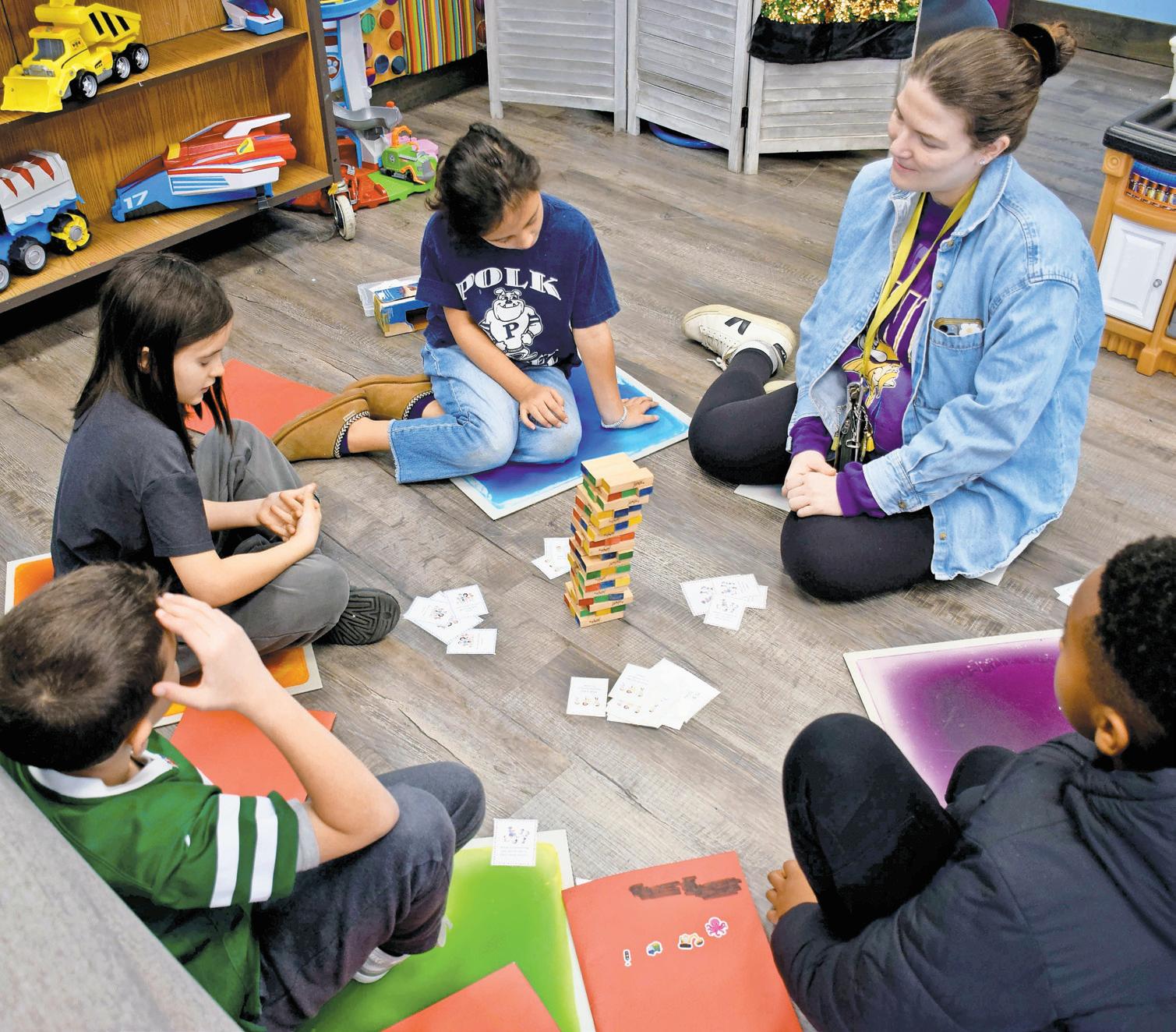 In the kitchen and dining area, students prepare a rice cake dessert before learning how to properly set a table and practice polite mealtime conversation. In the playroom, they strengthen peer connections through a game of Jenga that features getting-to-know-you questions about family, academics, hobbies and emotions.