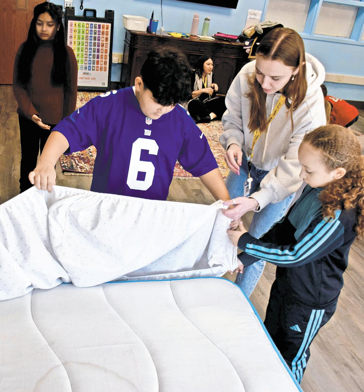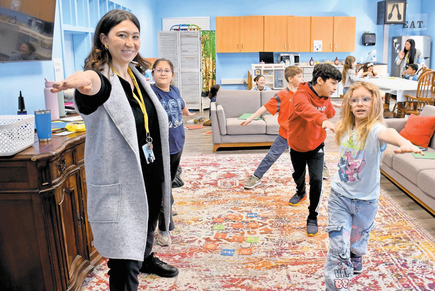 In the bedroom station, students practice everyday tasks such as making a bed, folding socks and sorting laundry. In the living room, they take part in a read-aloud of “I Am Yoga” by Susan Verde and participate in guided yoga exercises that promote mindfulness and