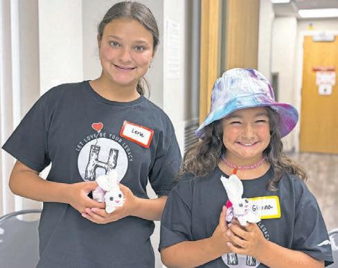 Lena Ripepe, left, and Gianna Frissora smile as they show off their finished bunny crafts, each with floppy ears and cotton tails.