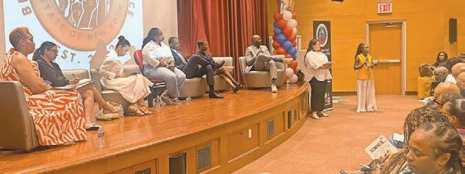 the Black Legislative task force hosted a listening session at roosevelt Library on July 24, to learn from residents how best to use the new funding. from left were Saeeda dunston, Ceo of elmer Youth and adult activities; therese daly, president of united Way of new York State; Jennifer Jones-austin, Ceo of the federation of protestant Welfare agencies assembly members Chantel Jackson, noah Burroughs and Kwani o’pharrow and State Sen. Siela Bynoe.