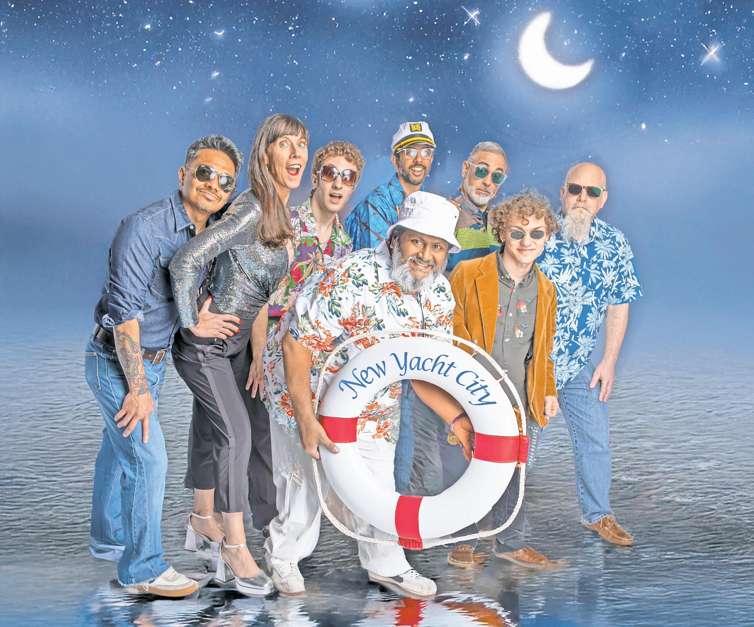 new Yacht City comprises ed Cipriano on guitar, vocalist Megan McCafferty, ed Crisonino on sax, nadir Jeevanjee on drums; Johnny Ramspacher on percussion, Killian Winn on bass, and Ken Feldman on trumpet. in front is bandleader Manish nag, on keyboards and vocals. alex Ranieri, a vocalist, is not pictured.