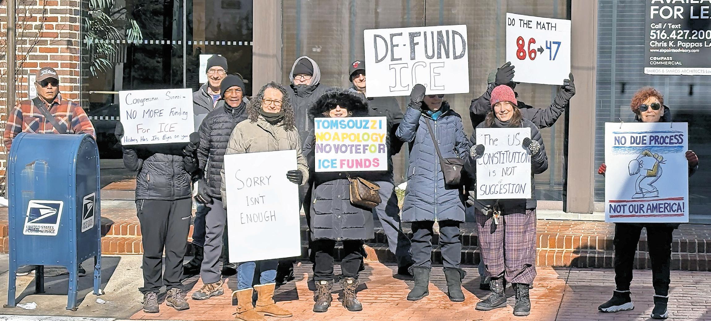 More than 50 current and former constituents gathered outside the Glen Cove office of Rep. Tom Suozzi on Monday, demanding the immediate cessation of funding for Immigration and Customs Enforcement after Suozzi, along with six other Democrats, crossed party lines to support a Department of Homeland Security funding bill that included major financial backing for the agency.