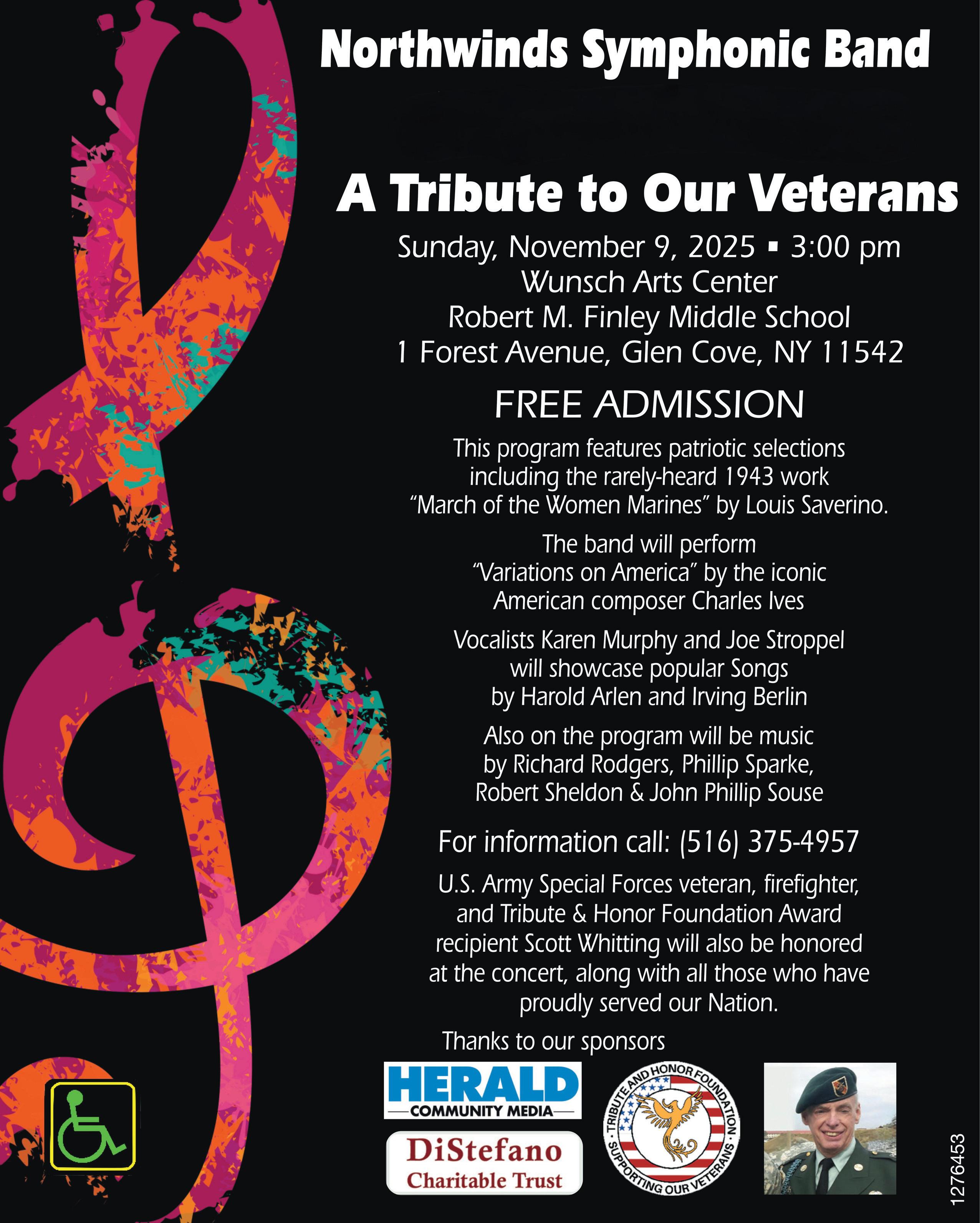 The Northwinds Symphonic Band will continue its annual tradition of honoring America’s veterans with a free concert on Nov. 9, at 3 p.m. at the Wunsch Arts Center in Glen Cove, featuring a patriotic program and a special tribute to U.S. Army veteran Scott Whitting.