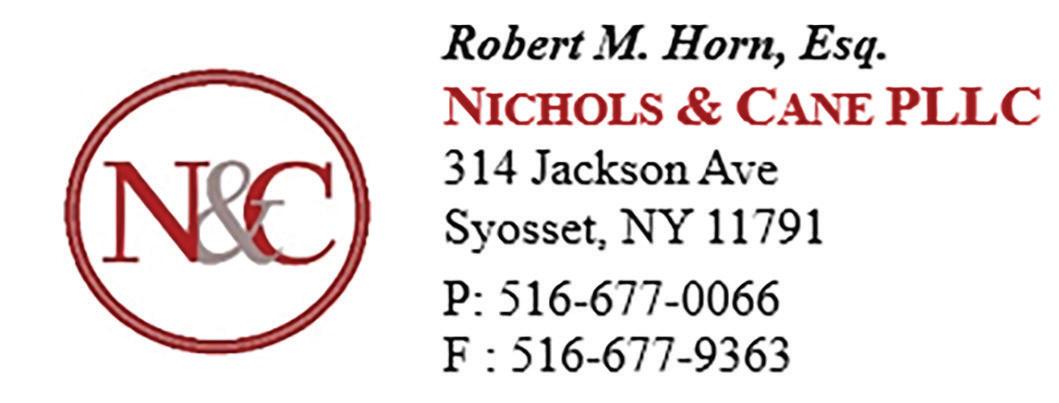 February 29, 2024 — BALDWIN HERALD 2 Life Insurance/ Retirement & Annuities Do you have an old 401K? We have options for your rollover. 1247027 INJURED? NO ATTORNEY’S FEES UNLESS WE COLLECT FOR YOU TELL US YOUR STORY. THE CONSULTATION IS FREE. Personal Injury Auto and Motorcycle Accidents Construction Accidents Slip/ Trip and Fall Accidents Wrongful Death Small Enough To Care Smart Enough To Win. 314 Jackson Ave Syosset, NY 11791 516-677-0066 RobertHorn@NClawNY.com Robert M. Horn, Esq. Nichols & Cane PLLC