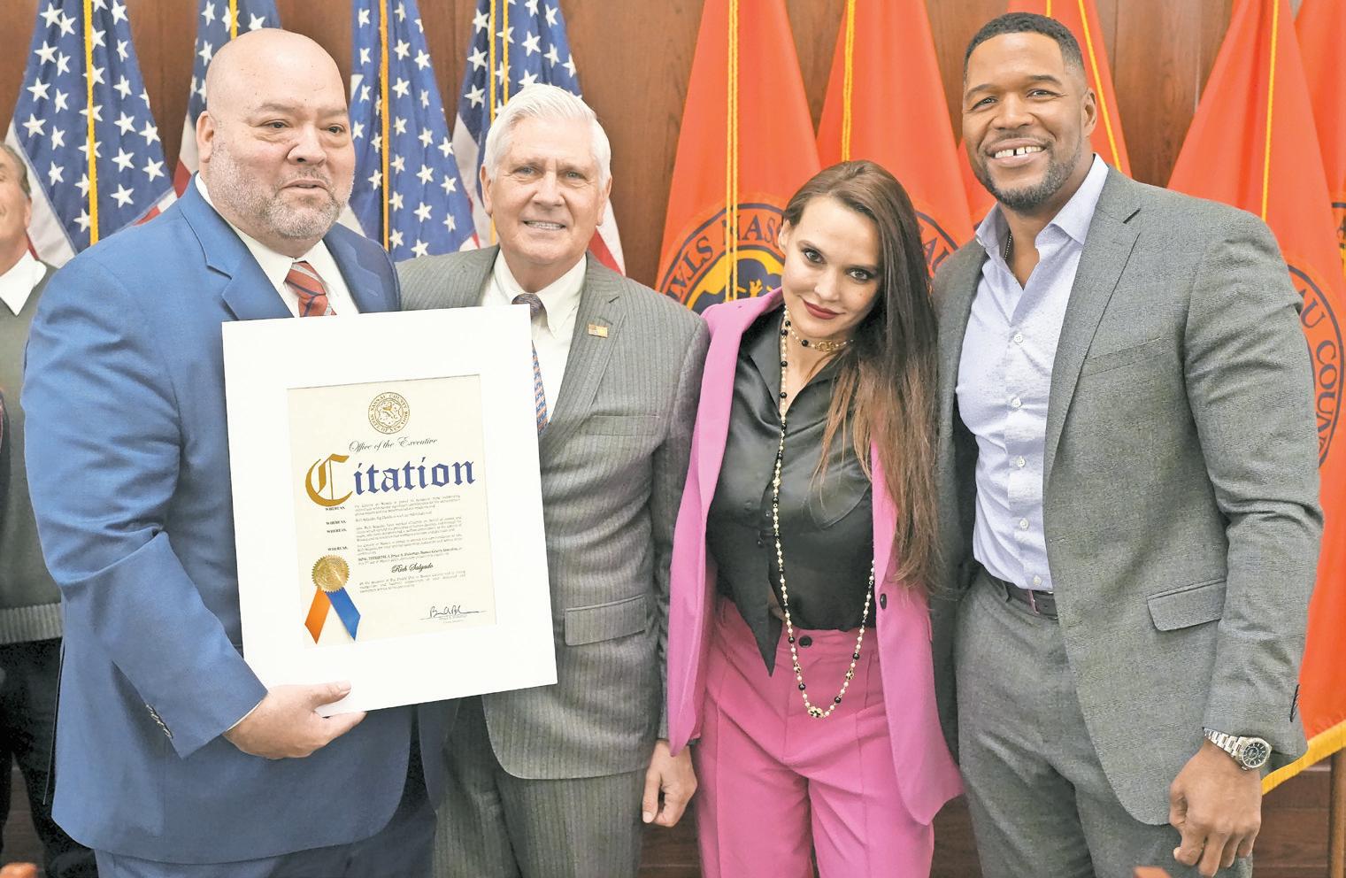 Rich SAlgAdO ReceiveS an official proclamation from Nassau County Executive Bruce Blakeman to make March 7 Rich ‘Big Daddy’ Salgado Day. His friends Anzhelika SteenOlsen and Michael Strahan praised Salgado for his many accomplishments as an insurance adviser.