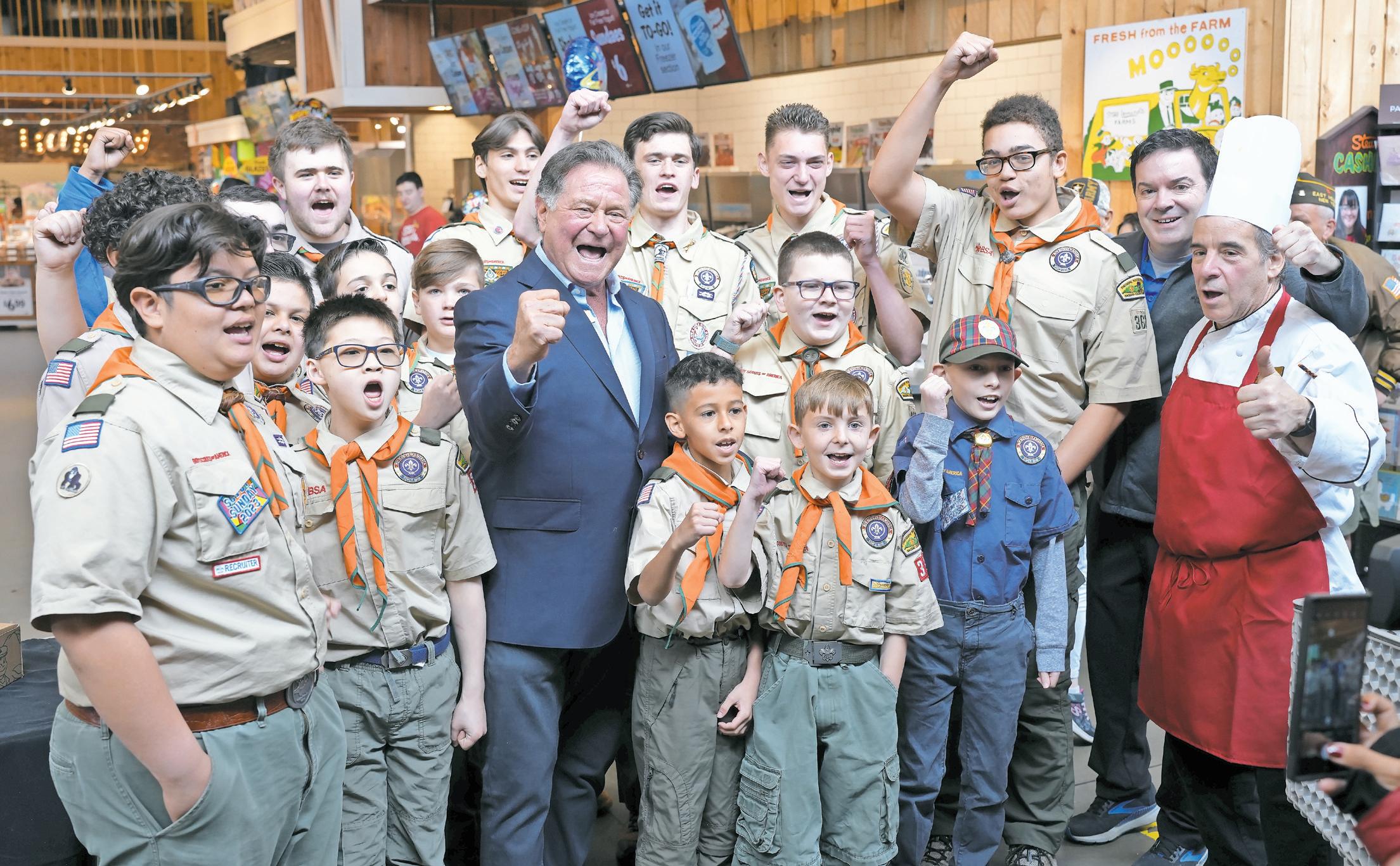 StEW LEoNARd’S, IN East Meadow, helped military families celebrate Easter this year. The store enlisted the help of local Boy Scouts, and other organizations, to pack boxes with food. Leonard, the president and CEO of the supermarket chain, is in the blue blazer.