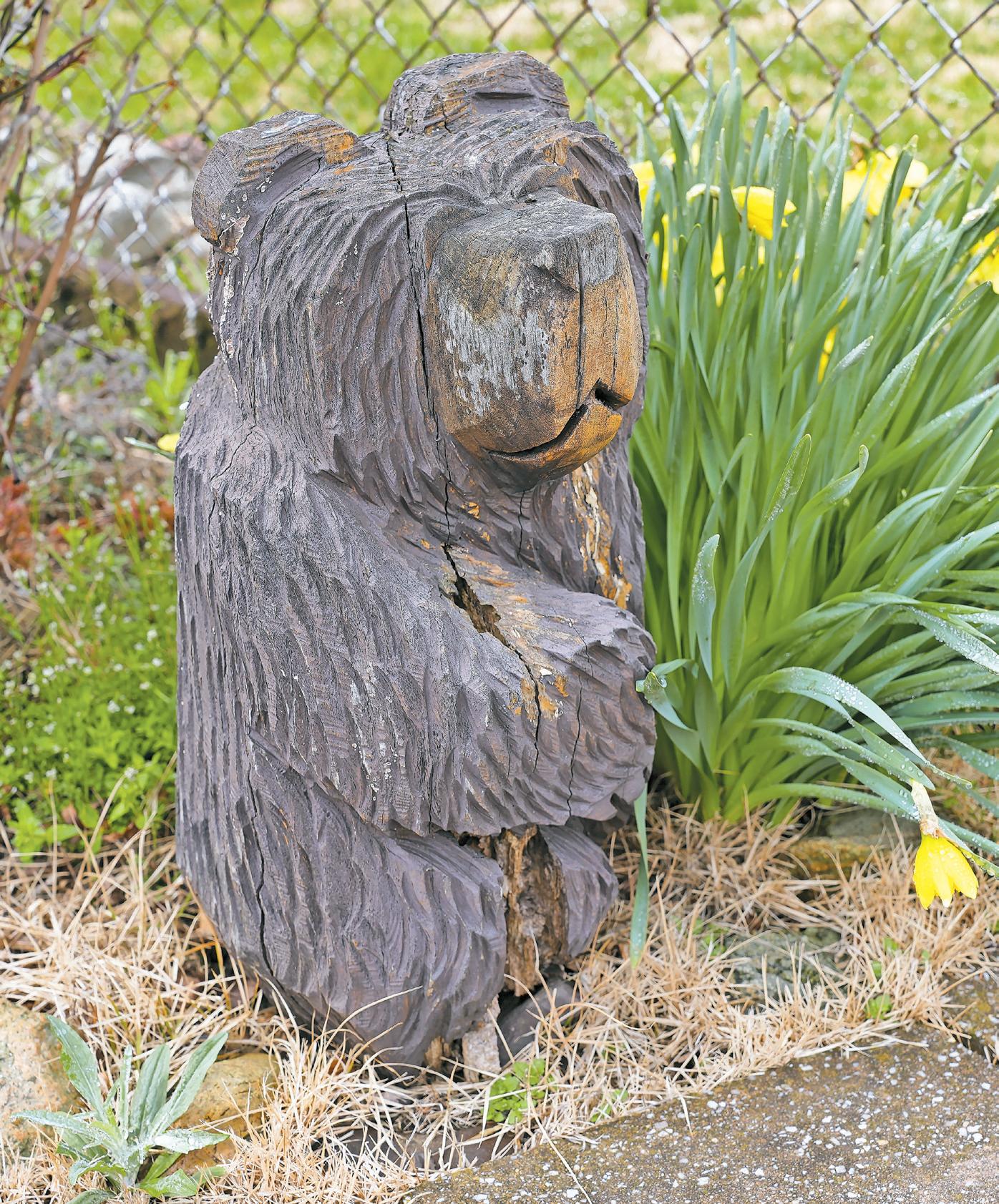 A wooden ursine sentry outside a home on Third Street — Glen Cove