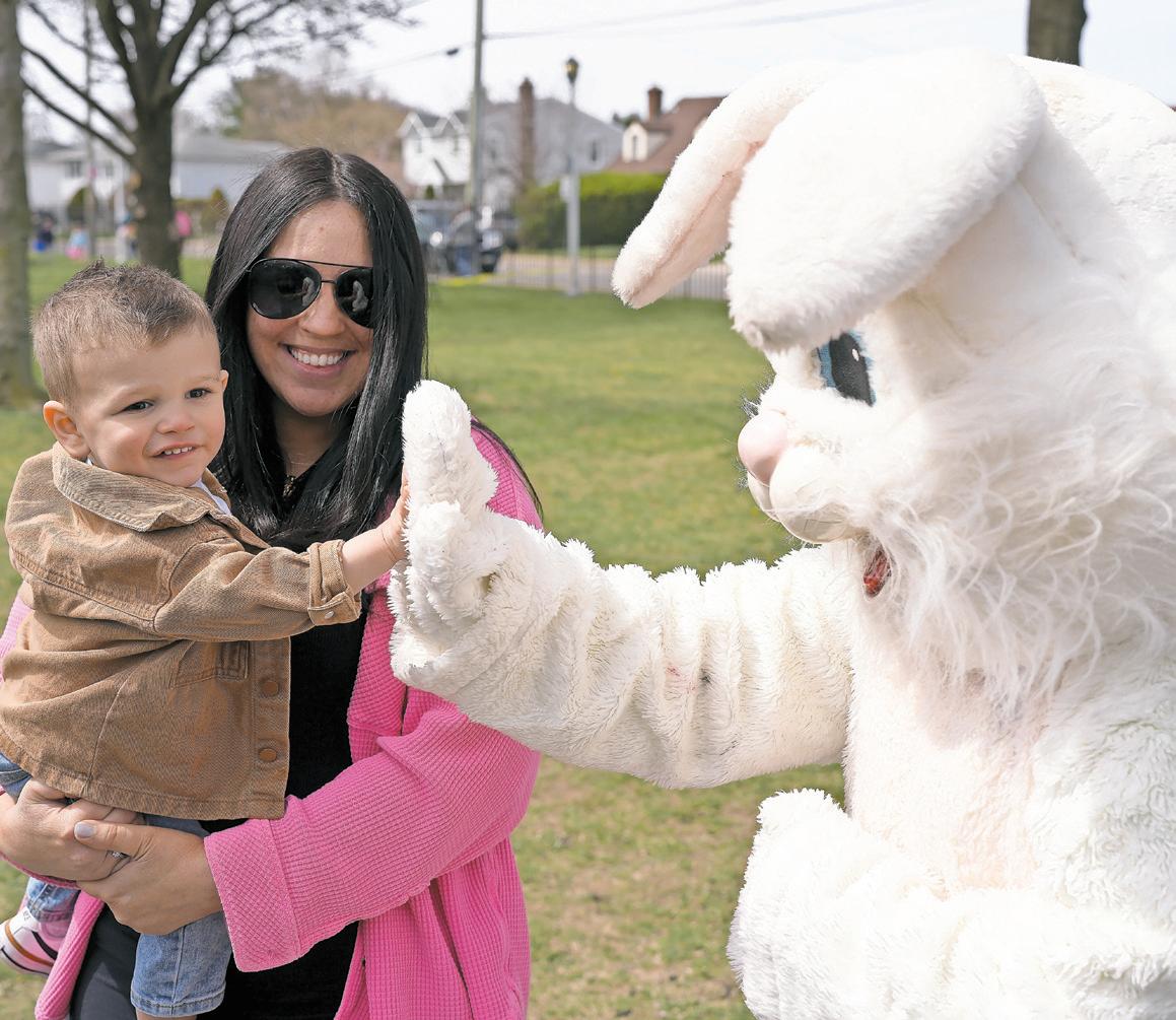 JAckie DArienzo, neAr left, held 1 year old Andrew Vacchio as he gave the Easter Bunny a high-five.