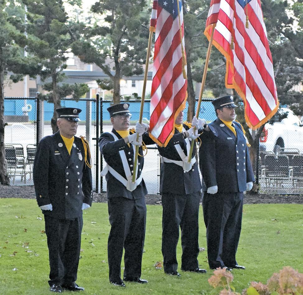 Above, junior firefighters Matteo Montoni, Gabriella Koch, Angel Wu, Joseph McLoughlin, Michael Dinolfo and John Hefferman at the ceremony. Right, firefighters David Paganini, Frank Cappaso, Benny Doyle and Lt. Michael Moniello.