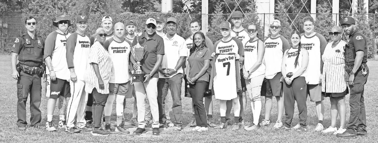 Hempstead Mayor Waylyn Hobbs, Jr., presented the trophy for the fourth annual Mayor’s Cup Softball Tournament in Campbell Park last Saturday. Deputy Mayor Jeffery Daniels, seventh from left, and County Legislator Olena