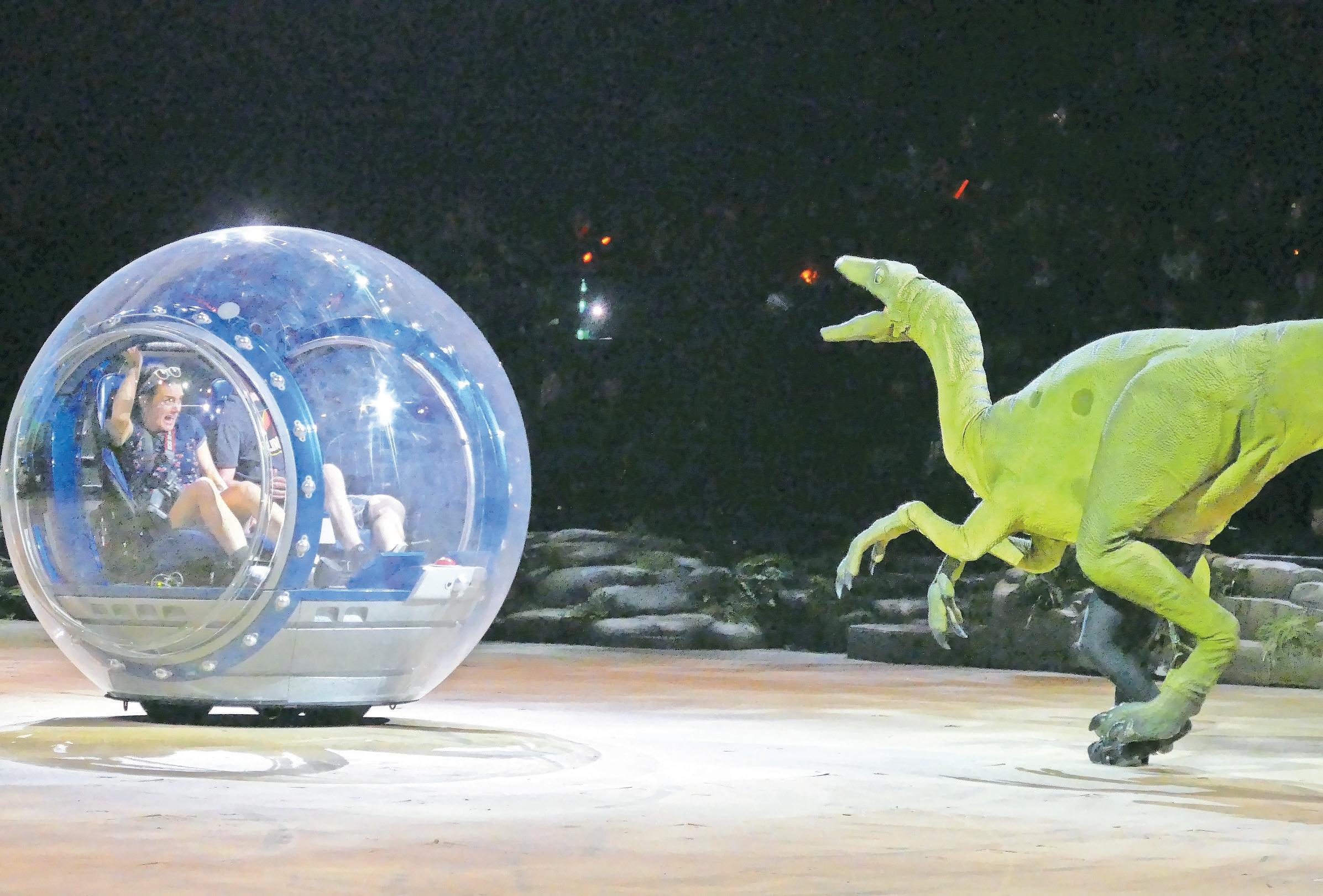 audience members are taken into the Jurassic world where dinosaurs ruled the land. a velocirapTor geTs ready to make its attack