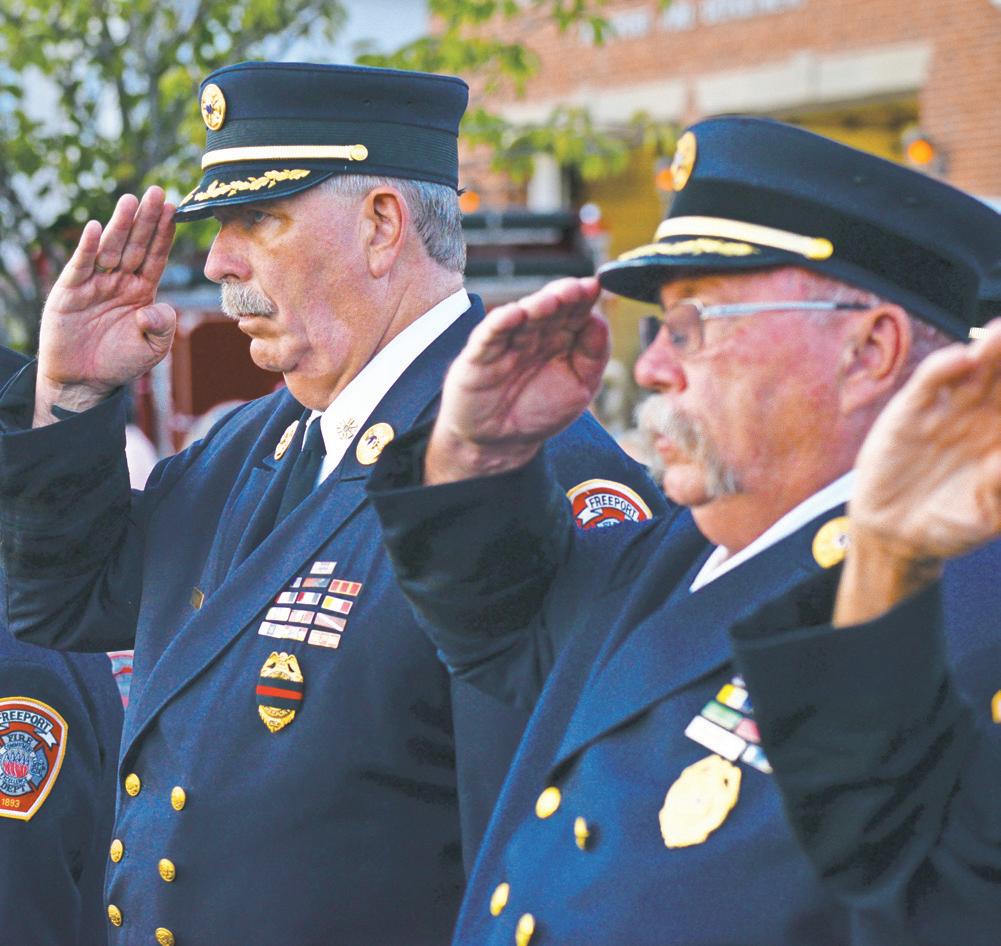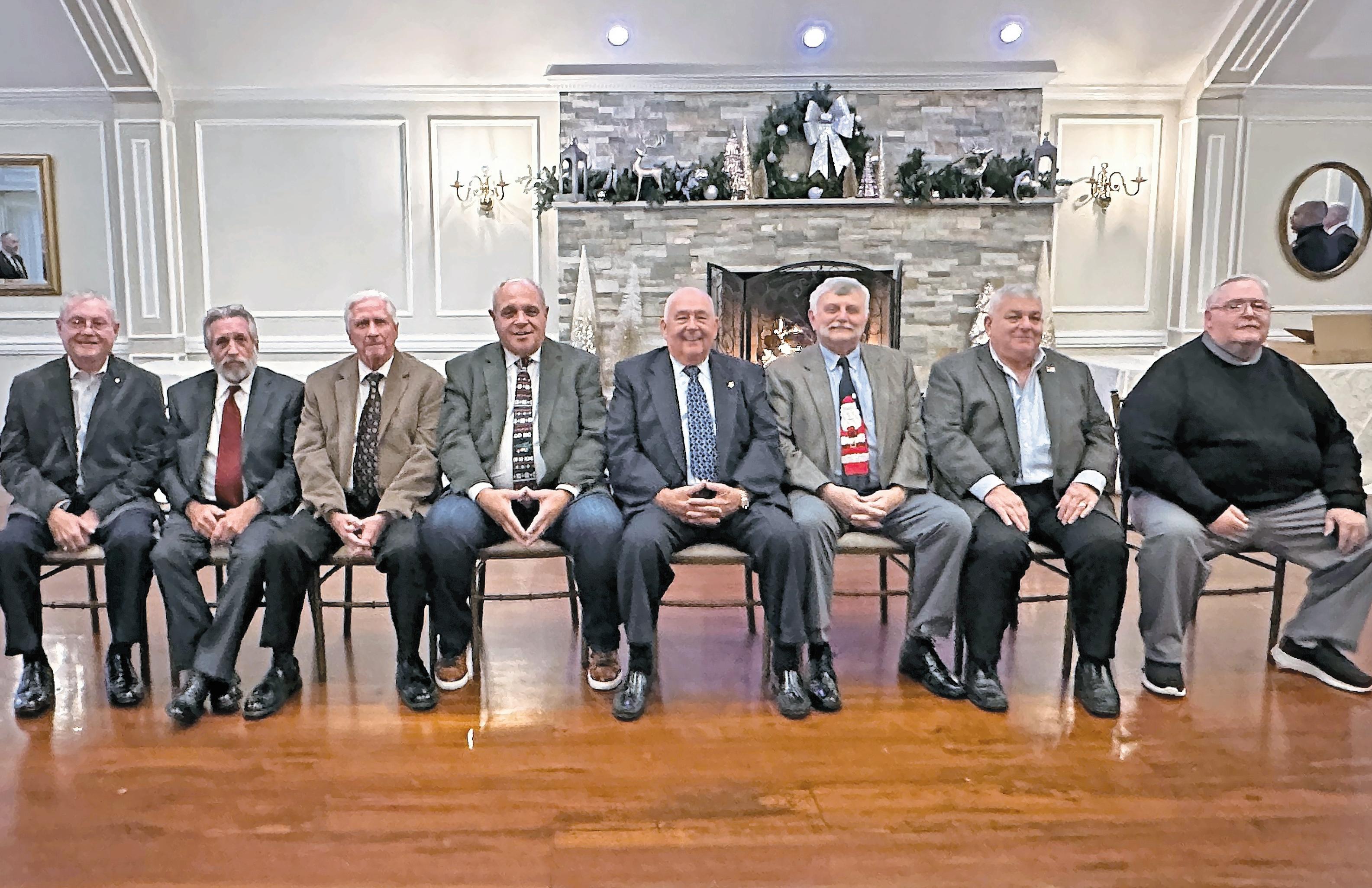 Attending the 150th anniversary dinner on Dec. 5 are members of Freeport’s Excelsior Hook & Ladder Company No. 1 who have racked up more than 50 years of service: from left, Chief George Mulholland, Hon. Chief John Bruscino, Hon. Chief John Mauersberger, Hon. Chief Anthony Fiore, Chief Stephen Wenk, Chief Donald Mauersberger, Hon. Chief Joseph Falco and Chief Richard Holdener.