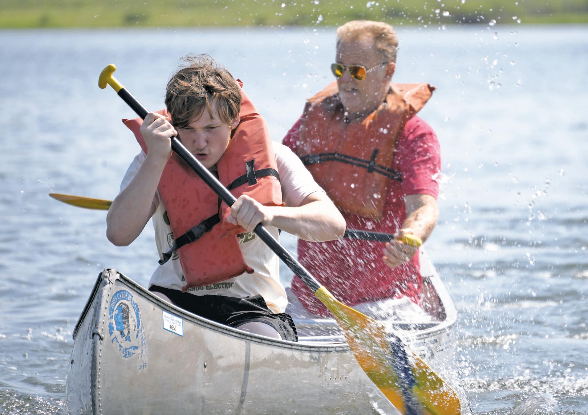 Robbie Jackson and Tony Jackson, father and son from Freeport on the water during this year’s 48th annual Great Freeport Canoe Race.