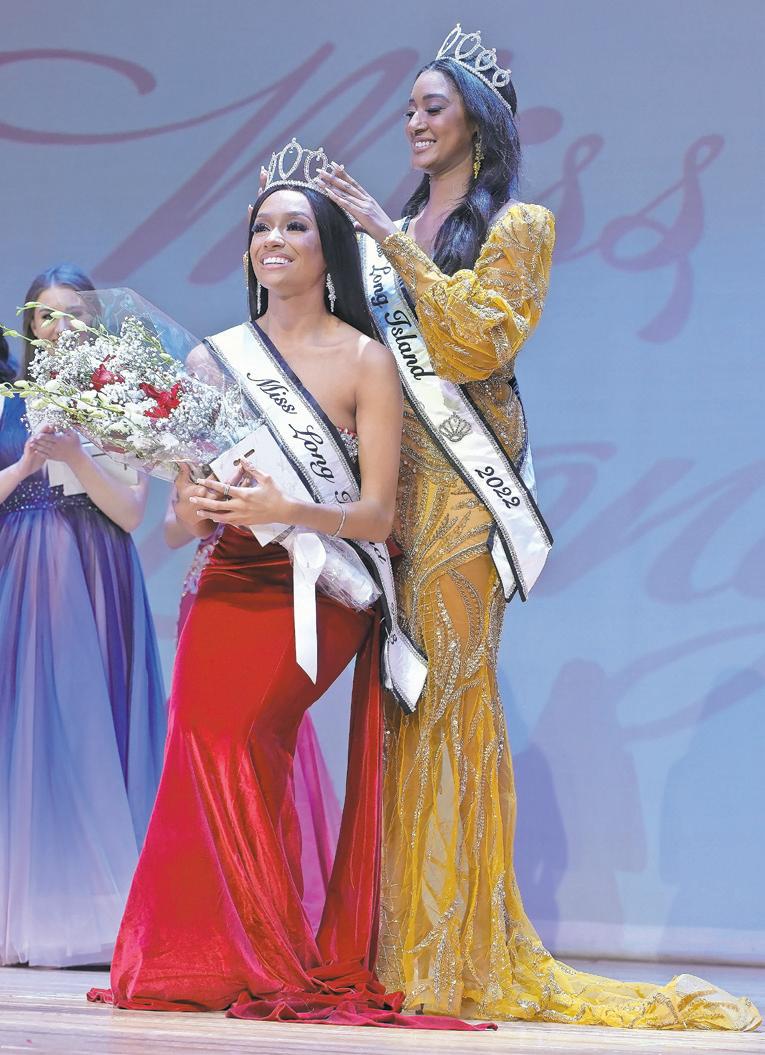 ThE 2022 Miss Long Island winner Nadgeena Jerome crowns fellow Baldwin native and 2023 Miss Long Island winner Lianne Webb.