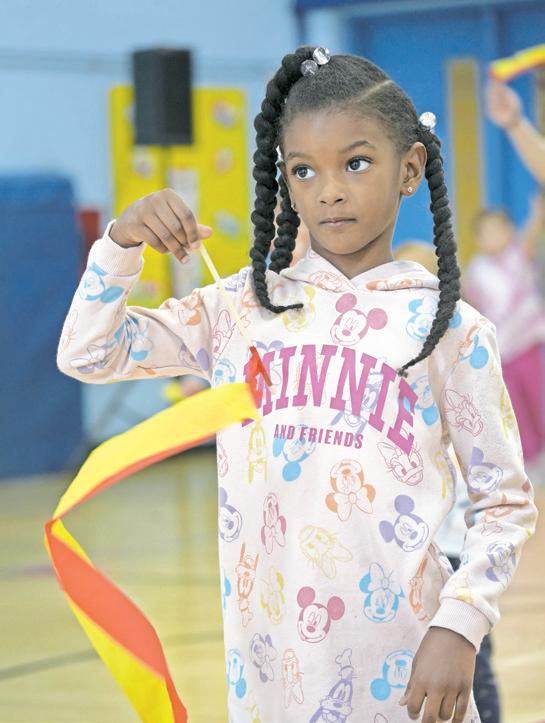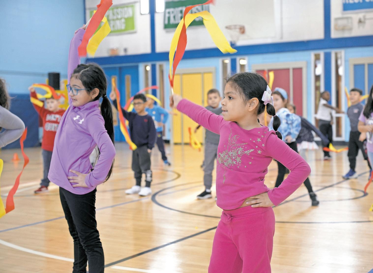 Alejandro Vargas–Amparo, a first-grader at Gribbin Elementary School, practices ribbon dancing. The class was offered to mark the Lunar New Year. More photos, Page 6.