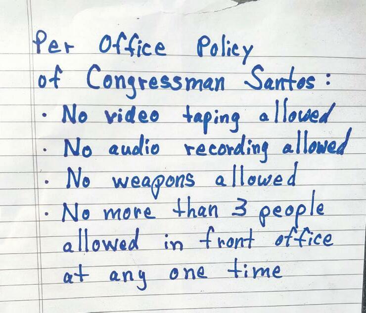 This news conference marked the first time that people could be seen working inside Santos’ office, although when Lafazan went to hand them the G.E.O.R.G.E. package the doors were locked. There was also a sign on the door demanding that no photos, video or audio recording in his office.