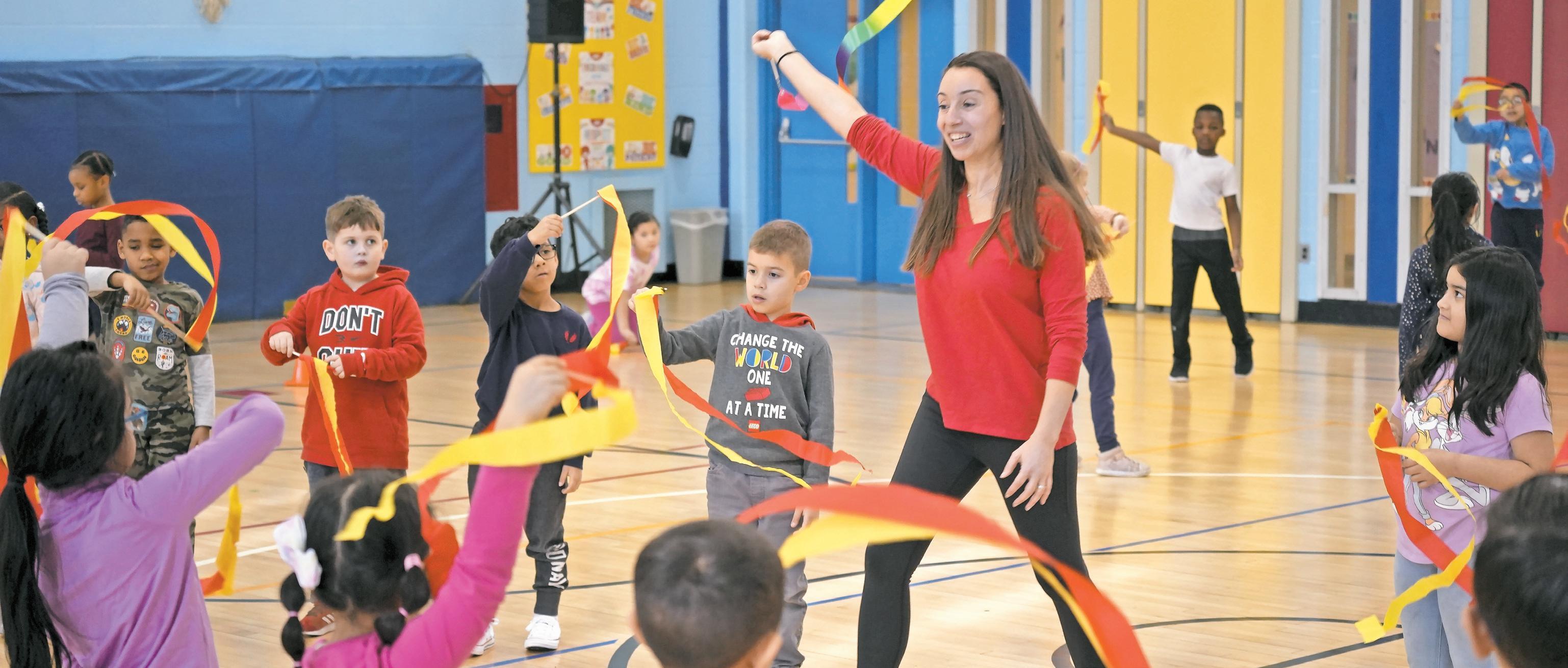 Kindergarten through second grade students at Gribbin Elementary School celebrated the Lunar New Year with a master class on Chinese ribbon dancing, presented by the American Street Dance Theater Company. Instructor Cara Fragias taught students about the cultural tradition of ribbon dancing and demonstrated to students how to ribbon dance guiding them through the process during their physical education classes.