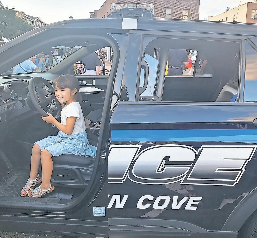 Mia Escobar, above left, is one of the evening’s many curious kids who sat behind the wheel of the city’s police cars.