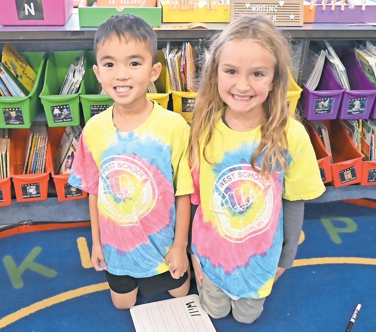 tWo youngsters at West electuary school ear the school’s multicolored tyedyed East school tee-shirts.