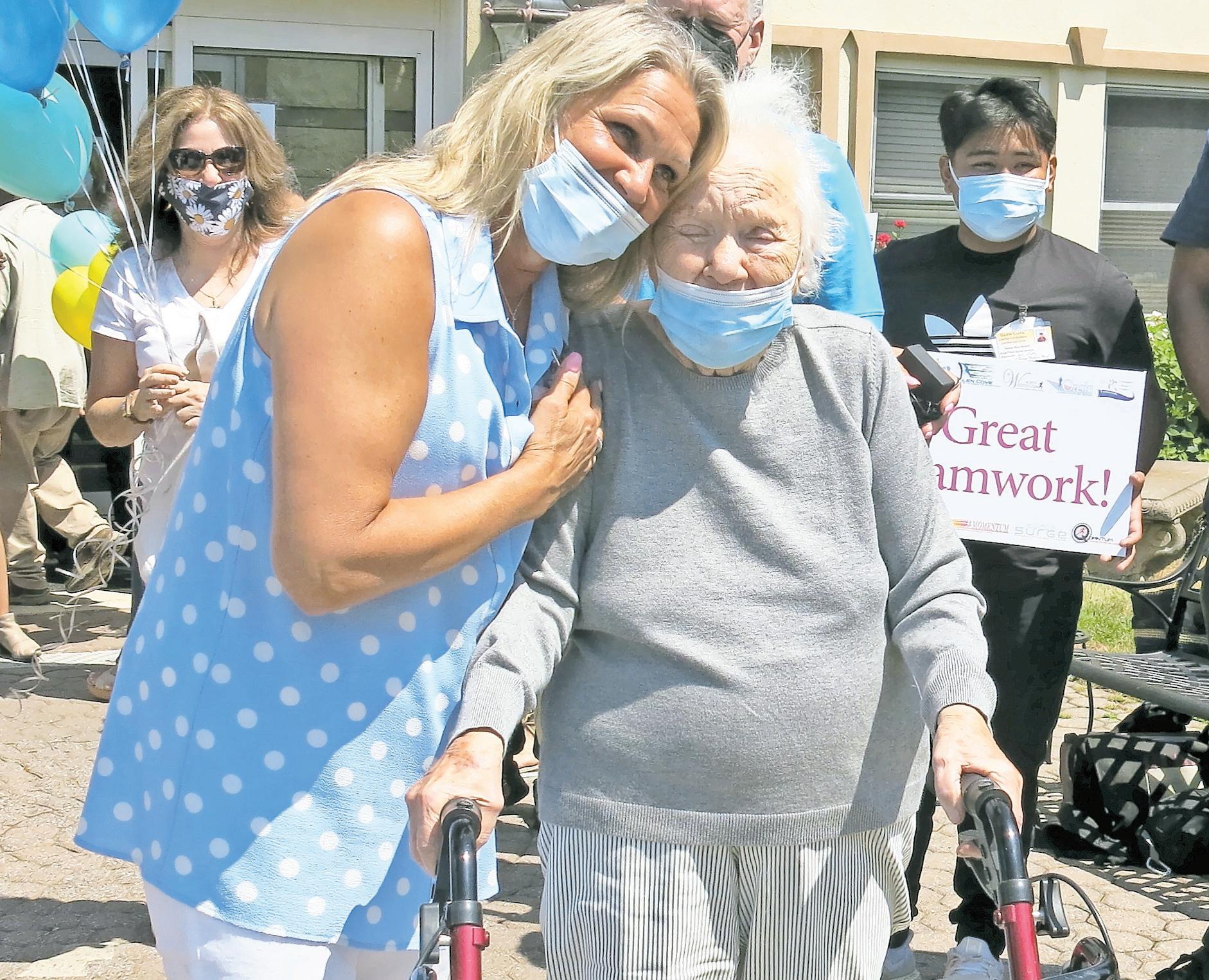 Laura Lane/Herald file NANCy CAsALE stops to thank pulmonary rehabilitation director Lynda Torel outside the Glen Cove Center for Nursing and Rehabilitation last July, after battling Covid-19 and its aftermath for months. Nancy never let her age — 95 — stand in the way.