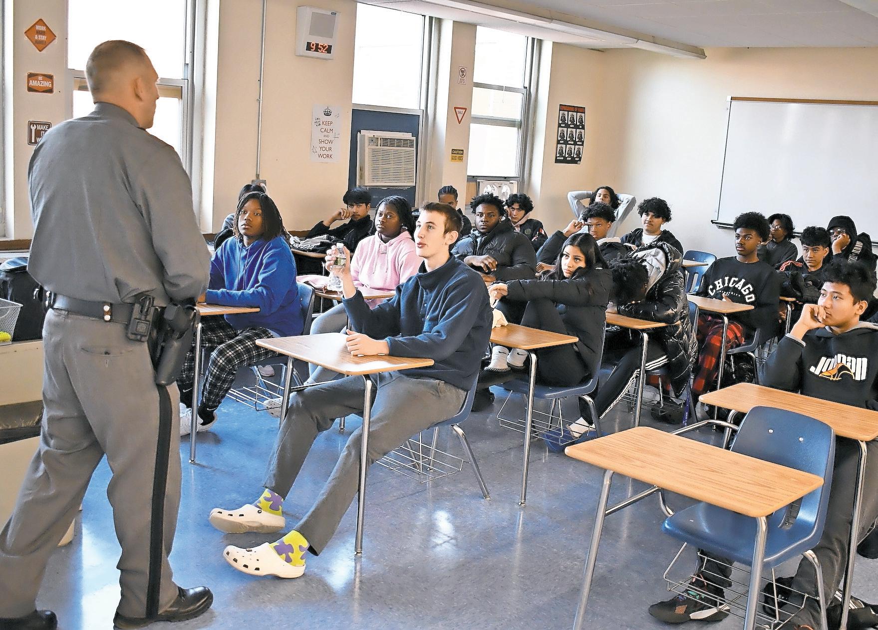 A New York State Trooper speaks with students about the variety of opportunities available within the New York State Police Department at Malverne High School Career Day.